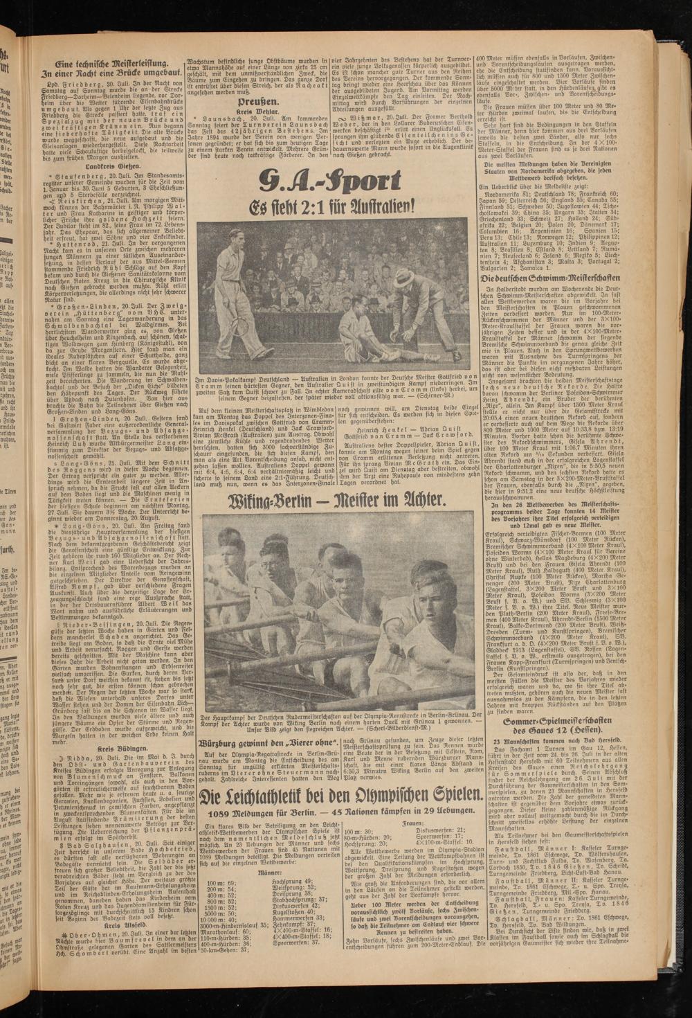 * Hattenrod, 21. Juli. In der vergangenen Nacht kam es in unserem Orte zwischen mehreren jungen Männern zu einer tätlichen Auseinandersetzung, in dessen Verlaus der aus Mittel-Seemen stammende Friedrich Rühl Schläge auf den Kopf bekam und durch die Gießener Sanitätskolonne vom Deutschen Roten Kreuz in die Chirurgische Klinik nach Gießen gebracht werden mußte. Rühl erlitt Körperverletzungen, die allerdings nicht sehr schwerer Natur sind.