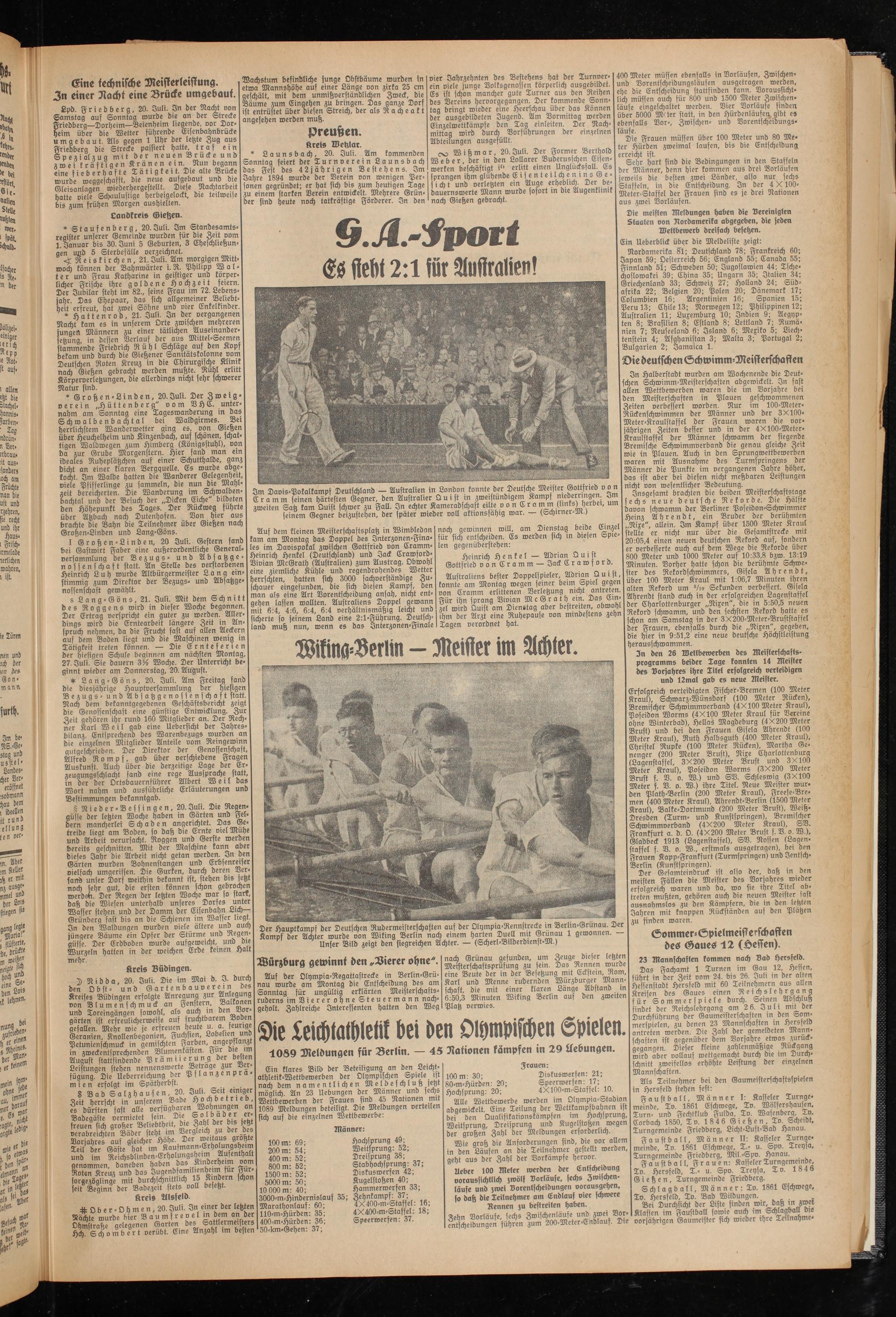 In Halberstadt wurden am Wochenende die Deutschen Schwimm-Meisterschaften abgewickelt. In fast allen Wettbewerben waren die im Vorjahre bei den Meisterschaften in Plauen geschwommenen Zeiten verbessert worden. Nur im 100-Meter- Rückenschwimmen der Männer und der 3X100- Meter-Kraulstaffel der Frauen waren die vorjährigen Zeiten besser und in der 4X100-Meter- Kraulstaffel der Männer schwamm der siegende Bremische Schwimmverband Die genau gleiche Zeit wie in Plauen. Auch in den Sprunawettbewerben waren mit Ausnahme des Turmspringens der Männer die Punkte im vergangenen Jahre höher, das ist aber bei diesen nicht meßbaren Leistungen nicht von wesentlicher Bedeutung.