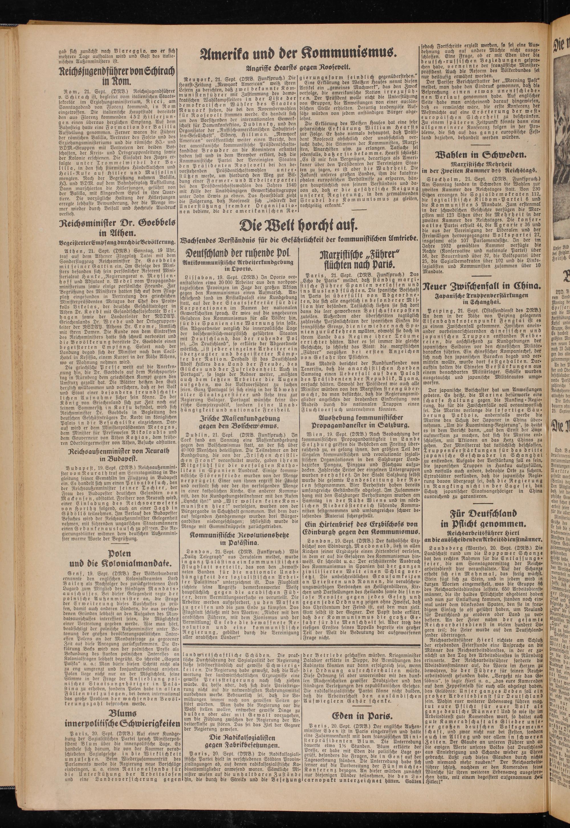 Die Erklärung des Weißen Hauses hat eine sehr geharnischte Erklärung William He ar st s zur Folge. Er habe niemals behauptet, daß Präsident Roosevelt absichtlich oder unabsichtlich versucht habe, die Stimmen der Kommunisten, Marxisten, Anarchisten usw. zu erlangen. Tatsache Jet jedenfalls, daß er s i e bekomme. Hearst schließt. „Es ist mir kein Vergnügen, derartiges als Amerikaner über den Präsidenten der Vereinigten Staaten zu sagen, es ist aber d i e Wahrst e i t. Die Zukunft unseres großen Landes, ihm die katastrophalen europäischen Verhältnisse zu ersparen, hangen hauptsächlich von seinem Verständnis und davon ab, daß er d i e gefährliche Neigung unserer Regierung, in den zermalmenden Strudei des Kommunismus zu gleiten, rechtzeitig erkennt."