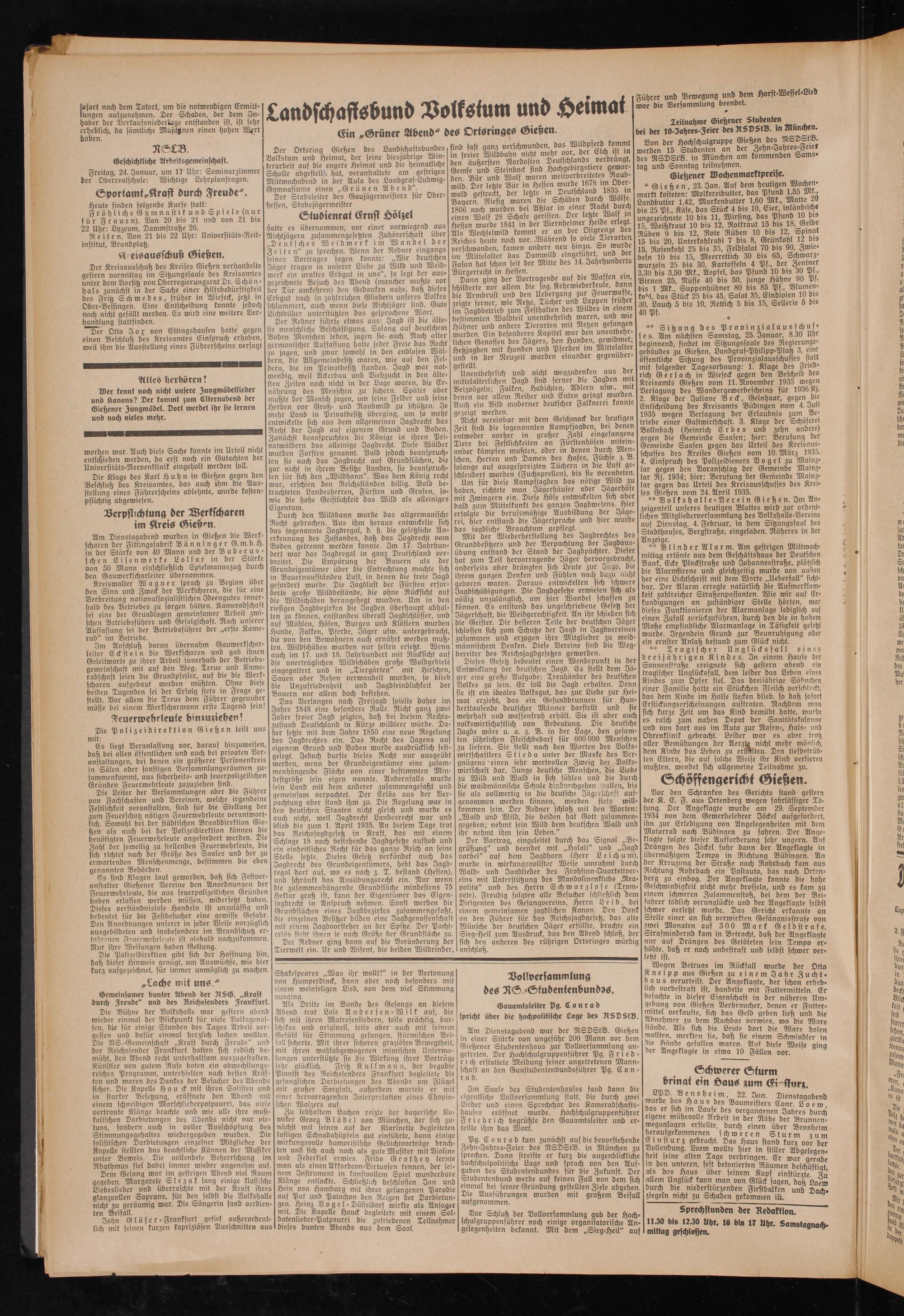 ** Sitzung des P r o v i n zi a laus sch u s- e s. Am nächsten Samstag, 25. Januar, 8.30 Uhr* beginnend, findet im Sitzungssaale des Regierungsgebäudes zu Gießen, Landgraf-Philipp-Platz 3, eine öffentliche Sitzung des Provinzialausschusses statt mit folgender Tagesordnung: 1. Klage des Friedrich Ger lach in Wiefeck gegen den Bescheid des Kreisamts Gießen vom 11. November 1935 wegen Versagung des Wandergewerbescheins für 1936 Kj. 2. Klage der Juliane Beck, Gelnhaar, gegen die Entscheidung des Kreisamts Büdingen vom 4. Juli 1935 wegen Versagung der Erlaubnis zum Betriebe einer Gastwirtschaft. 3. Klage der Schäferei Bollnbach (Heinrich Erbes und zehn andere) gegen die Gemeinde Saasen; hier: Berufung der Gemeinde Saasen gegen das Urteil des Kreisausschusses des Kreises Gießen vom 10. März 1935. 4. Einspruch des Polizeidieners Vogel zu Mainzlar gegen den Voranschlag der Gemeinde Mainzlar Rj. 1934; hier: Berufung der Gemeinde Mainzlar gegen das Urteil des Kreisausschusses des Kreises Gießen vom 24. Avril 1935.
