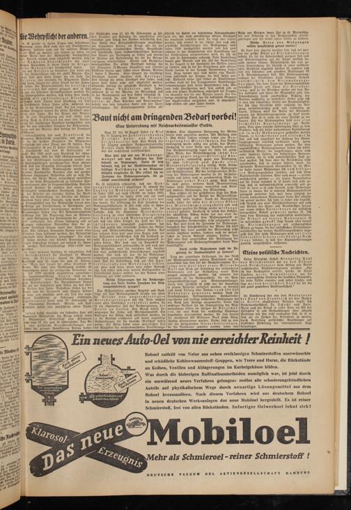 Was durch die bisherigen Raffinationsmethoden unmöglich war, ist jetzt durch ein umwälzend neues Verfahren gelungen: restlos alle schmierungsfeindlichen Anteile auf physikalischem Wege durch neuartige Lösungsmittel aus dem Rohoel herauszulösen. Nach diesem Verfahren wird aus deutschem Rohoel in neuen deutschen Werksanlagen das neue Mobiloel hergestellt. Es ist reiner Schmierstoff, frei von allen Rückständen. Sofortiger Oelwechsel lohnt sich!