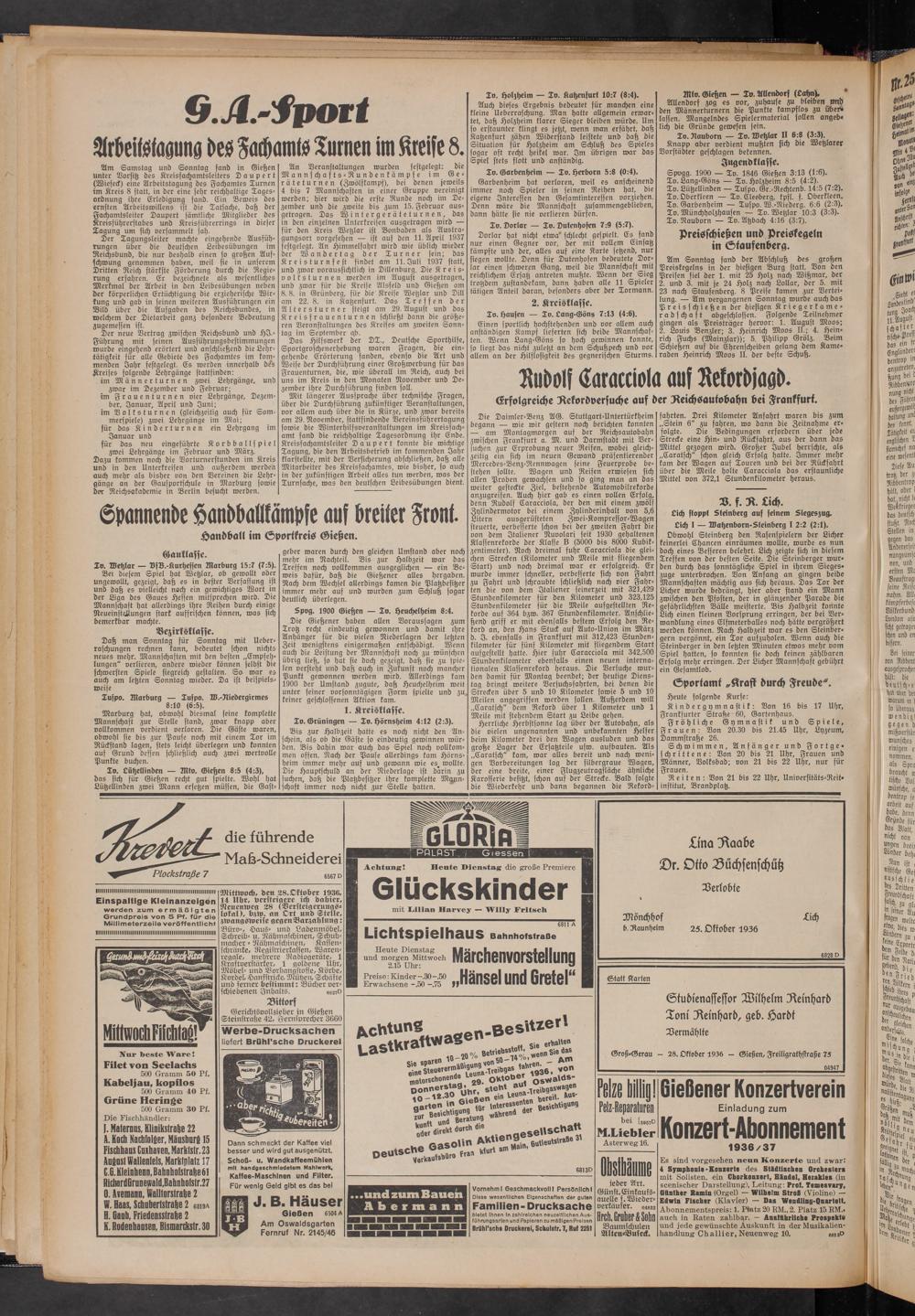 An Veranstaltungen wurden festgelegt: die Mannschafts-Rundenkämpfe im G e - räteturnen (Zwölfkampf), bei denen jeweils 4 bis 7 Mannschaften in einer Gruppe vereinigt werden; hier wird die erste Runde noch im Dezember und die zweite bis zum 15. Februar ausgetragen. Das Wintergeräteturnen, das in den einzelnen Unterkreisen ausgetragen wird — für den Kreis Wetzlar ist Bonbaden als Austragungsort vorgesehen — ist auf den 11. April 1937 festgelegt. An Himmelfahrt wird wie üblich wieder der Wandertag der Turner sein; das Kreisturnfest findet am 11. Juli 1937 statt, und zwar voraussichtlich in Dillenburg. Die Kreisvolksturnen werden im August ausgetragen, und zwar für die Kreise Alsfeld und Gießen am