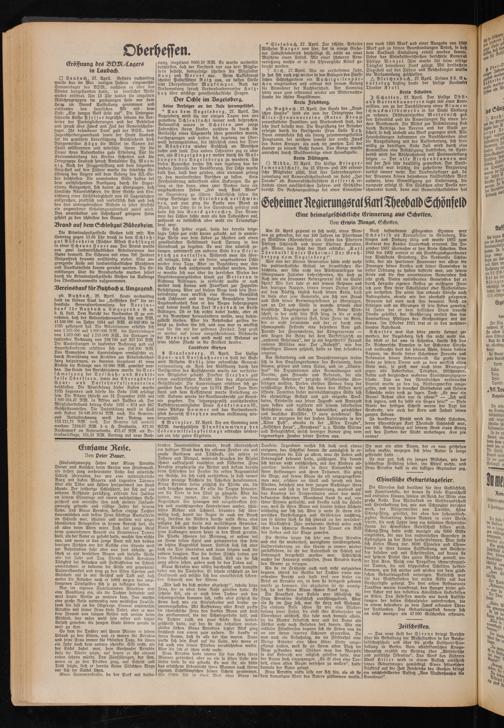 Am 29. April geziemt es sich wohl, eines Mannes zu gedenken, der vor 100 Jahren im Pfarrhaus M Wöllstein (Rheinhessen) als Sohn des Pfarrers Philipp Schönfeld und seiner Ehefrau Karoline, geb. Maier, das Licht der Welt erblickte: „Karl Theobald! Unser Geheime! Der Großherzog vom Vogelsberg!"