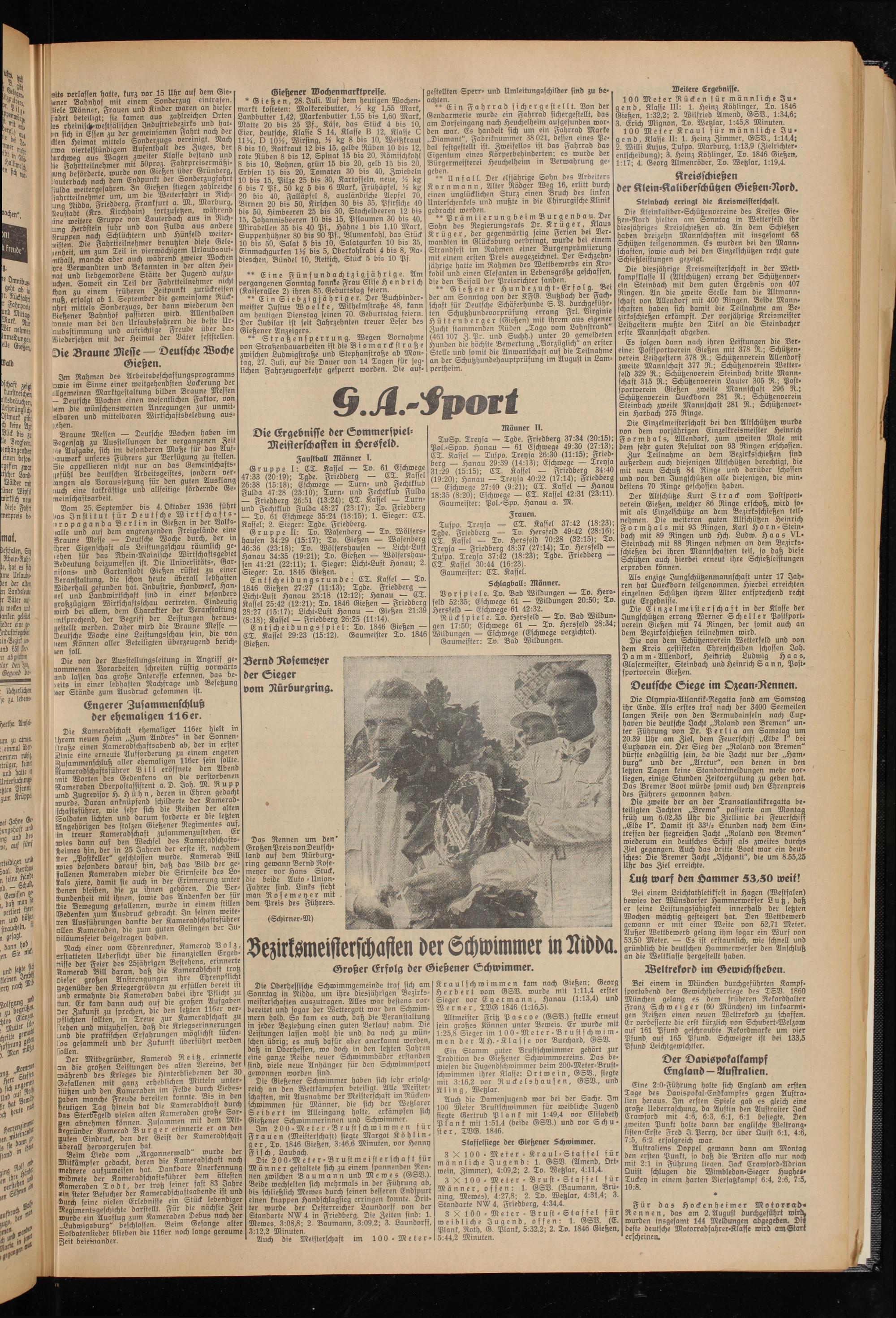 Im 200-Meter-Brustschwimmen für Frauen (Meisterschaft) siegte Margot Köhl in - g e r, Tv. 1846 Gießen, 3:46,6 Minuten, vor Henny