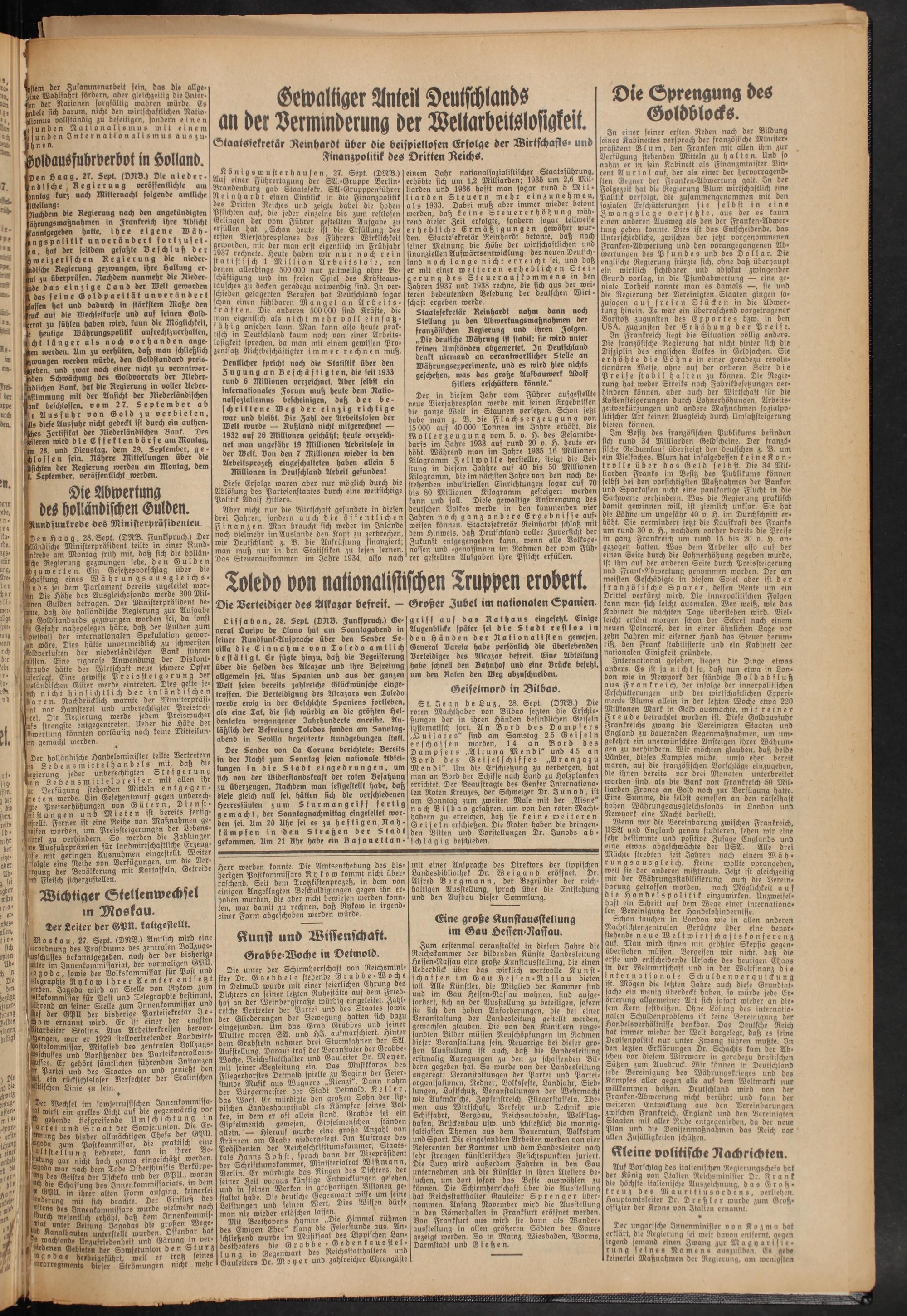 Staatssekretär Reinhardt nahm dann noch Stellung zu den Abwertungsmahnahmen der französischen Regierung und ihren Folgen. „Die deutsche Währung ist stabil; sie wird unter keinen Umständen abgewertet. In Deutschland denkt niemand an verantwortlicher Stelle an Währungsexperimente, und es wird hier nichts geschehen, was das große Ausbauwerk Adolf Hitlers erschüttern könnte."