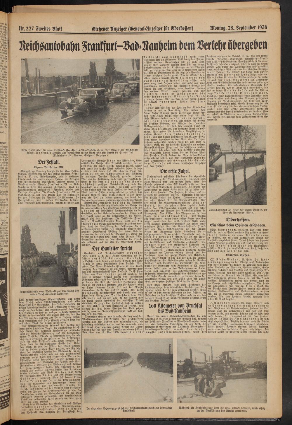 Der gestrige Sonntag brachte für den Gau Hessen- Nassau, insbesondere für das Gebiet zwischen Frankfurt a. M. und Bad-Nauheim, und in weiterem Sinne auch für unsere engere Heimat ein Ereignis von weittragender Bedeutung. Gestern wurde die Reichsautobahn Strecke Frankfurt a. M. — Bad- Nauheim ihrer Bestimmung übergeben. Auch die Autobahnstrecke Heidelberg — Bruchsal wurde dem Verkehr übergeben. Die Strecke Frankfurt a. M. — Bad-Nauheim hat eine Länge von 40 Kilometer, die von Heidelberg bis Bruchsal 35 Kilometer. Die Fertigstellung dieser beiden Teilstrecken bedeutet eine eminente Arbeitsleistung, vollbracht unter zum