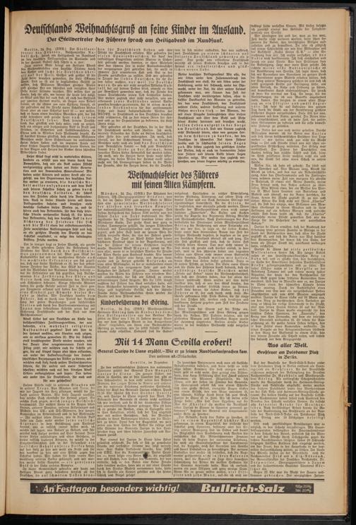 Weine deutschen Volksgenossen! Wir alle, die wir litten unter dem Zusammenbruch des Deutschland von einst, die wir litten unter der Entehrung, unter der Schmach, unter der Ohnmacht, unter der Not, die über unsere Heimat gekommen war, wir können das Fest der Deutschen nicht vorübergehen lassen, ohne in tiefster Dankbarkeit des Wannes zu gedenken, der das neue Deutschland, das Deutschland unserer Liebe, unserer Hoffnung und unseres Stolzes werden lieh — des Wannes, der mit einer Hingabe sondergleichen über diesem Deutschland und über dem Wohl und Wehe seiner Kinder herinnen und draußen wacht, dessen Leben aufgeyt in der Sorge um Deutschland. And wir können zugleich nicht Weihnacht feiern, ohne von ganzem Herzen dem höheren zu danken, der den Deutschen in schwerster Not ihren Führer sandte und so sichtbarlich seinen Segen gab. Wir bitten zugleich den göttlichen Lenker der Welten, daß er auch im kommenden Jahre dem Führer und seinem Volke seinen Segen schenken möge. Wir wollen ihm zugleich versprechen, uns seines Segens würdig zu erweisen.