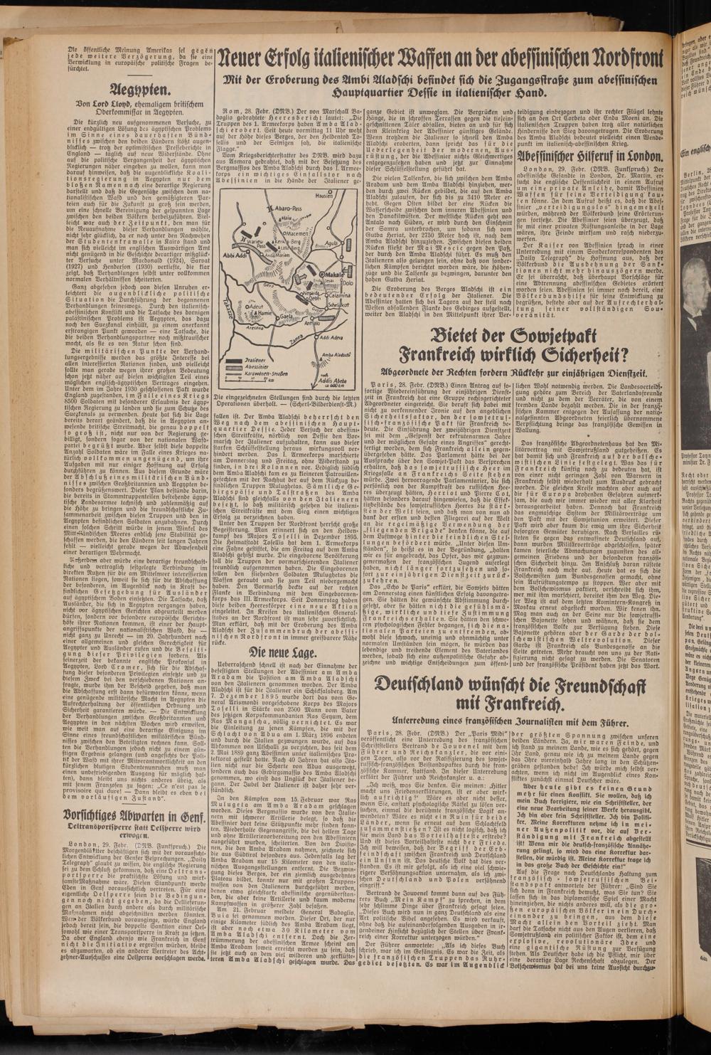 Vom Kriegsberichterstatter des DNB. wird dazu aus Asmara gedrahtet, daß mit der Besetzung des Bergmasfios des Amba Aladschi durch das I. Armeekorps ein wichtiges Einfallstor nach Abessinien in die Hände der Italiener ge-
