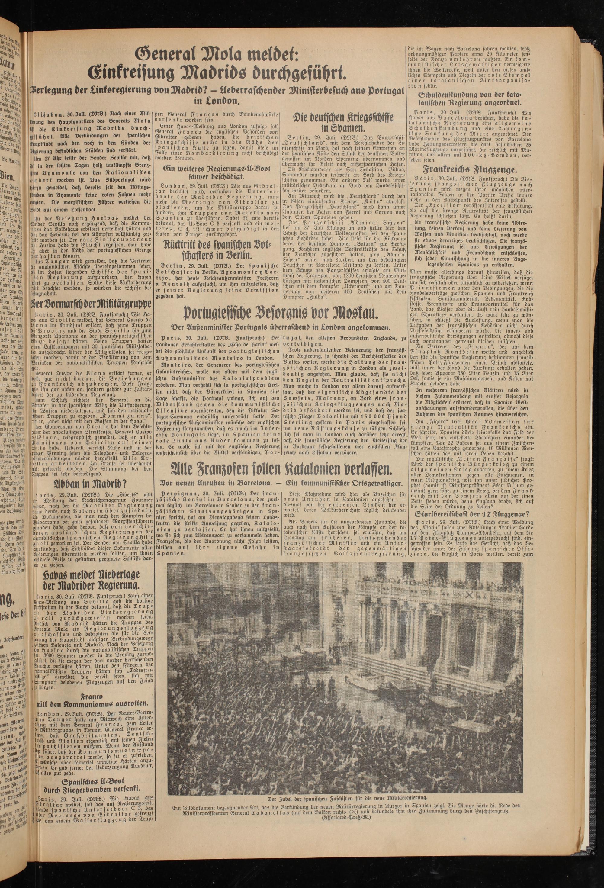 Einer Havas-Meldung aus London zufolge soll General Franco die englischen Behörden von Gibraltar gebeten haben, die britischen Kriegsschiffe nicht in die Nähe der spanischen Küste zu legen, damit diese im Falle einer Bombardierung nicht beschädigt werden könnten.