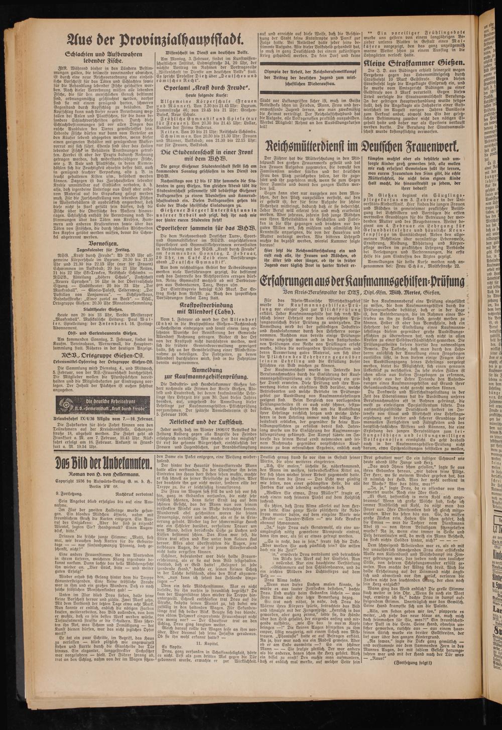 NSG. „Kraft durch Freude": Ab 20.30 Uhr allgemeine Körperschule im Lyzeum; 20.30 bis 21.30 Uhr und 21.30 bis 22.15 Uhr (nur für Frauen) Schwimmen im Volksbad; 20 bis 21 Uhr Reiten, 21 bis 22 Uhr Ski-Trocken, Reitschule Schömbs. — NSLB., Abteilung „Höhere Schule", Fachschaft „Neuere Sprachen": 16 Uhr in der Oberrealschule Sitzung. — Stadttheater: 20 bis 23 Uhr „Der Maskenball". — Gloria-Palast, Seltersweg: „Der Postillon von Lonjumeau". — Lichtspielhaus, Bahnhofstraße: „Einer zuviel an Bord". — VHC., Ortsgruppe Gießen: 20.30 Uhr Monatsversammlung.