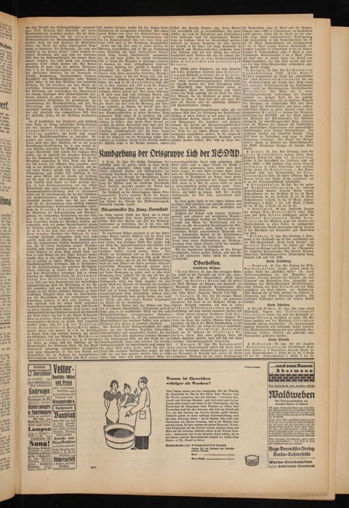 ein Sohn unserer Stadt, das Wort, um in seiner etwa einstündigen Rede seinen Zuhörern ein plastisches Bild vom Wollen und Ziel des Nationalsozialismus zu vermitteln, den er als eine vollkommen neue Geisteshaltung und Geistesrichtung bezeichnete.