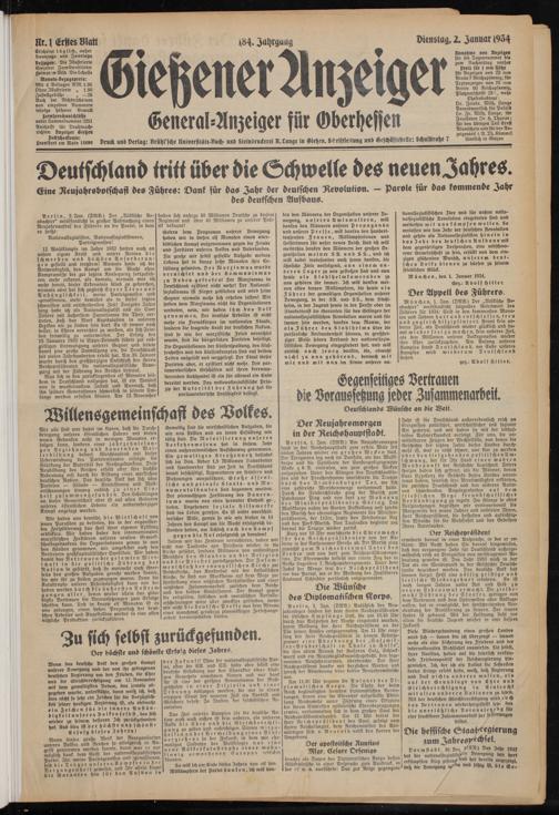 tionalsozialistischen Idee und für unsere nationalsozialistische Revolution eingetreten sind und weiterhin mit uns kämpfen wollen. So verlassen wir das Jahr der deutschen Revolution und gehen als Nationalsozialisten hinein in das Jahr des deutschenAufbausmit dem gegenseitigen Versprechen, eine verschworene Gemeinschaft zu sein, erfüllt von dem einzigen glühenden Wunsch, unserem deutschen Volke dienen zu dürfen zu seinem friedlichen Glück.