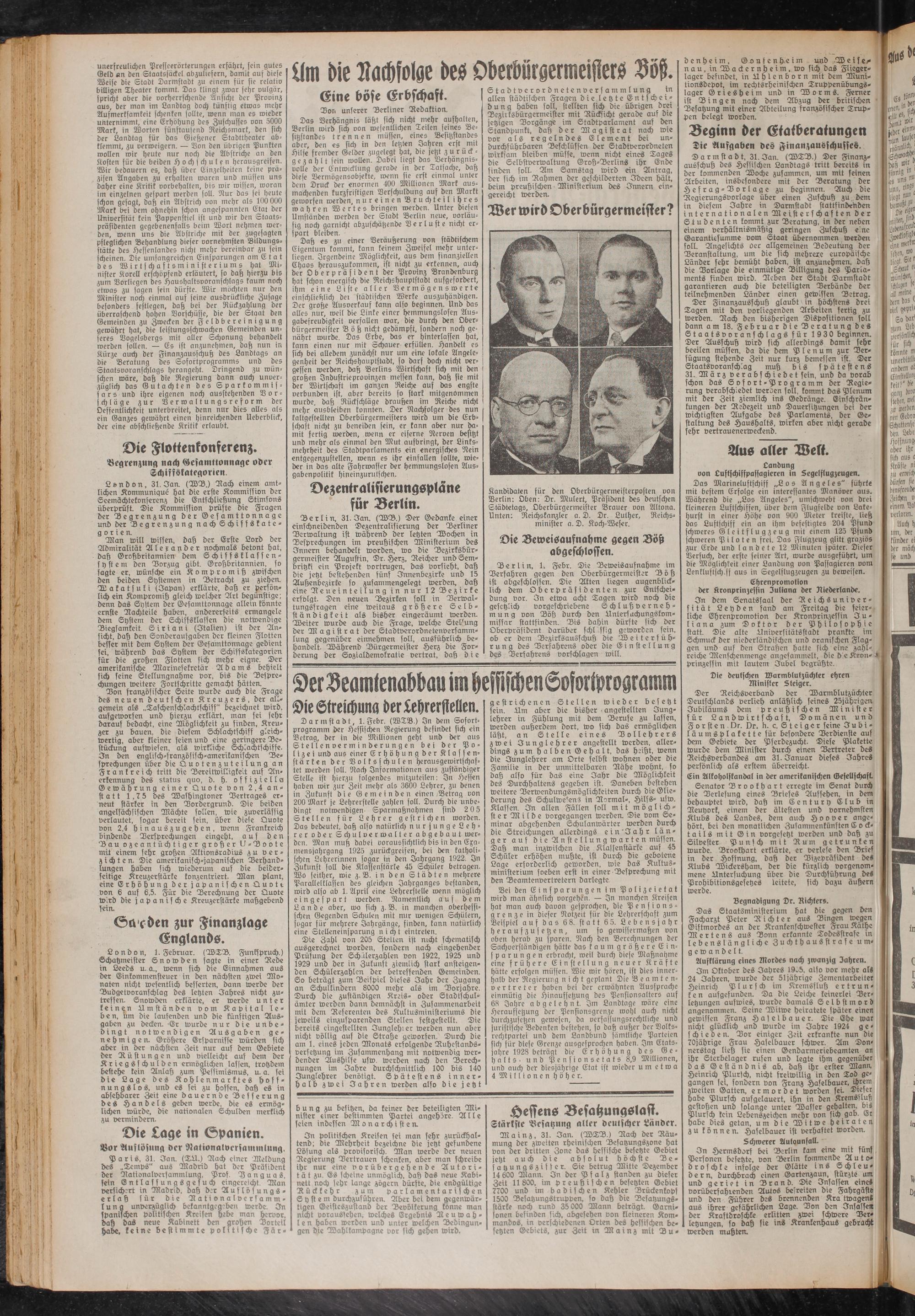 Kandidaten für den Oberbürgermeisterposten von Berlin: Oben: Dr. Mulert, Präsident des deutschen Städtetags, Oberbürgermeister Brauer von Altona. Unten: Reichskanzler a. D. Dr. Luther, Reichsminister a. D. Koch-Weser.