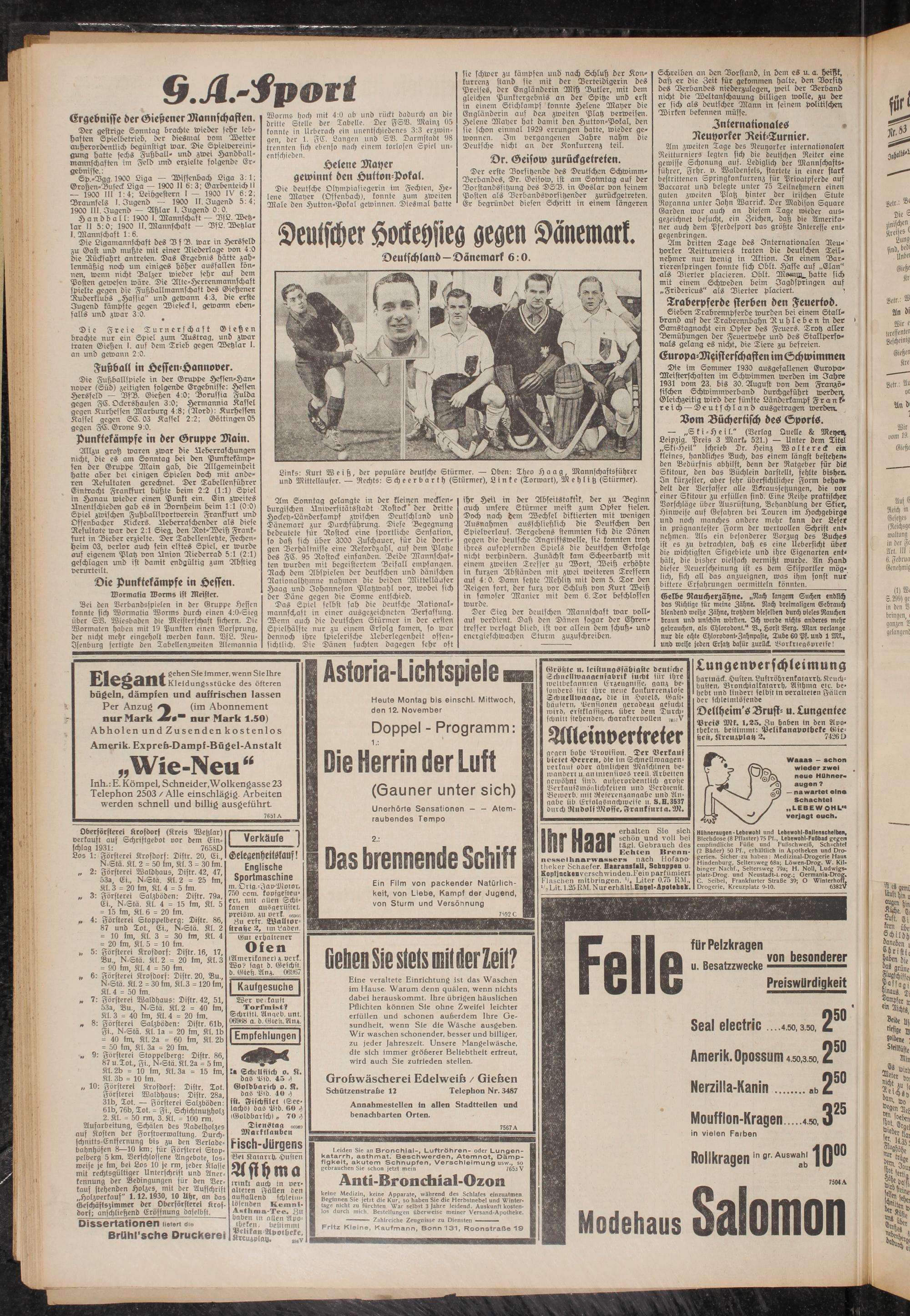 sie schwer zu kämpfen und nach Schluß der Konkurrenz stand sie mit der Verteidigerin des Preises, der Engländerin Miß Butler, mit dem gleichen Punktergebnis an der Spitze und erst in einem Stichkampf konnte Helene Mayer die Engländerin auf den zweiten Platz verweisen. Helene Mayer hat damit den Hutton-Pokal, den sie schon einmal 1929 errungen hatte, wieder gewonnen. Im vergangenen Jahre nahm die Deutsche nicht an der Konkurrenz teil.