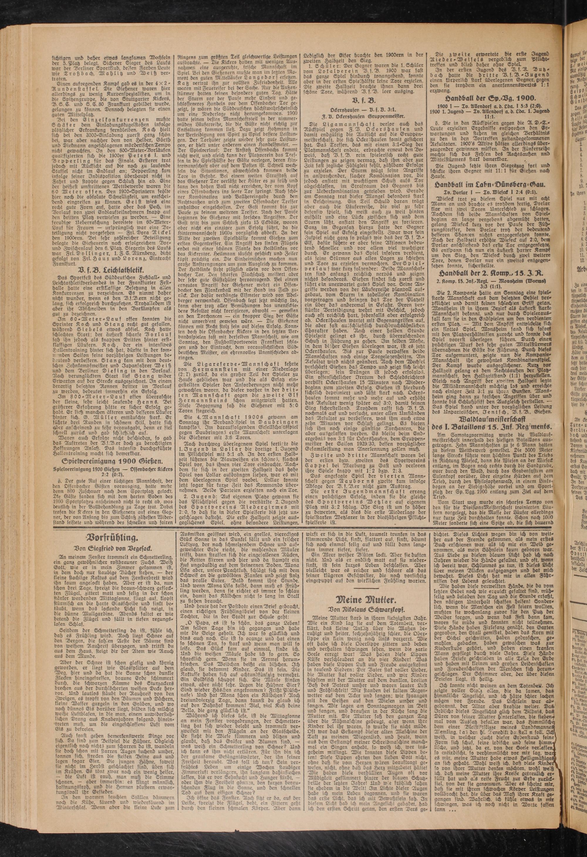 Die 2. Kompanie hatte am Sonntag eine spielstarke Mannschaft aus dem besetzten Gebiet verpflichtet und damit keinen schlechten Griff getan. MonLheim ist in ihrem Vezirk als äußerst starke Mannschaft bekannt, und nur durch Spielerausfall kam sie in den Endspielen um den verdienten ersten Platz. — Mit dem Anpftff entwickelte sich ein flottes Spiel. Monsheim fand sich sofort mit den Plahverhältnissen zurecht und konnte das Spiel vorerst überlegen führen. Durch einen prächtigen Wurf des sehr guten Mittelstürmers übernahmen die Gäste die Führung. Durch dieses Tor aufgemuntert, zeigte nun die Kompanie- Mannschaft ihr gewohntes Kombinationsspiel. Der Kampf wurde ausgeglichener. Kurz vor Halbzeit gelang es dem Rechtsaußen der Platzmannschaft, den Halbzeitstand (1:1) herzustellen. Gleich nach Angriff der zweiten Halbzeit legte die Militärmannschaft mächtig los und erreichte nach einiger Zeit 3:1 zu ihren Gunsten. Monsheim ging dann zu forschen Angriffen über und tonnte bis Schlußpfiff den Ausgleich Herstellen. — Das Spiel stand unter der vorzüglichen Leitung des Unparteiischen, Ie n t sch, 2. f. 2., Gießen.