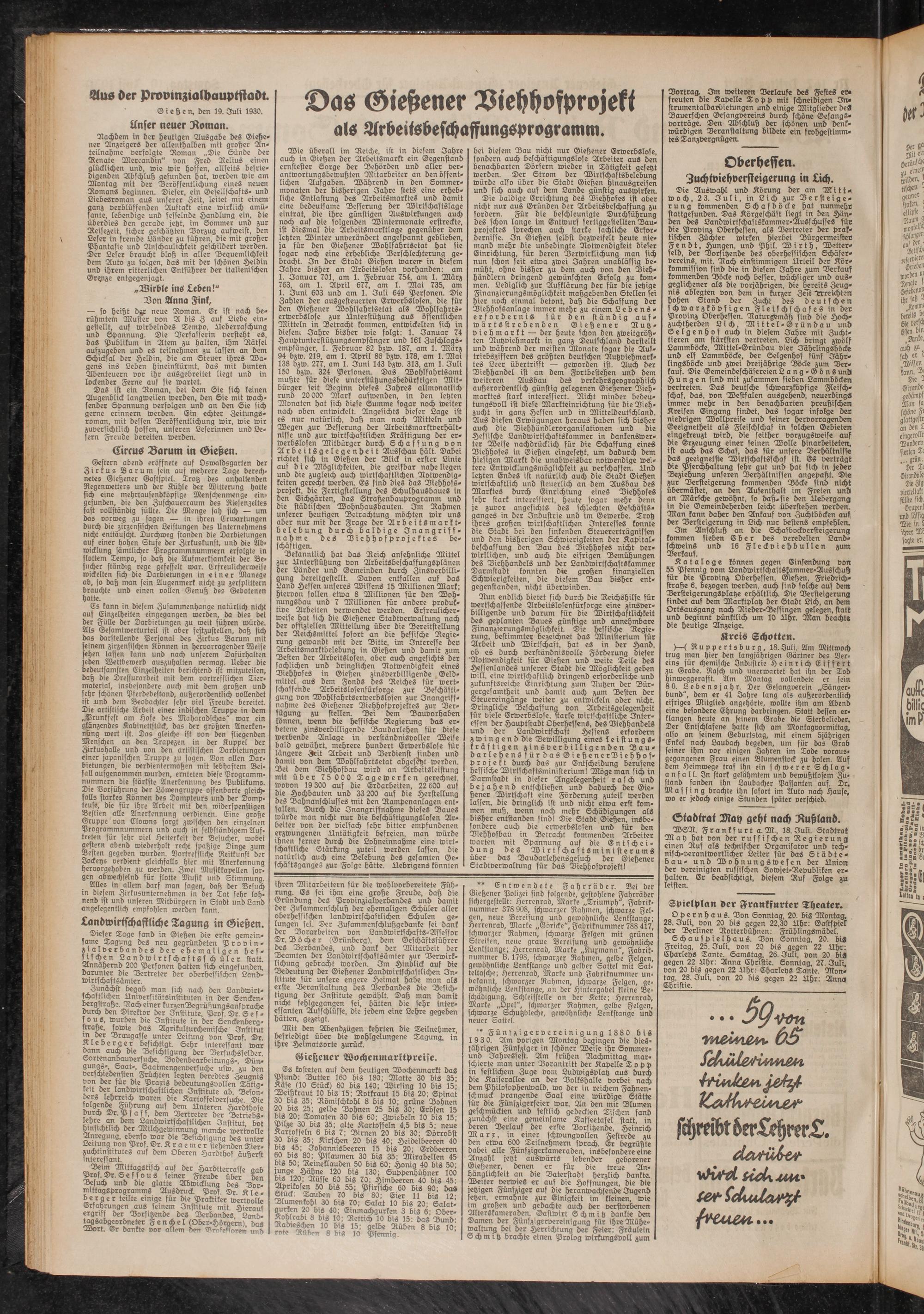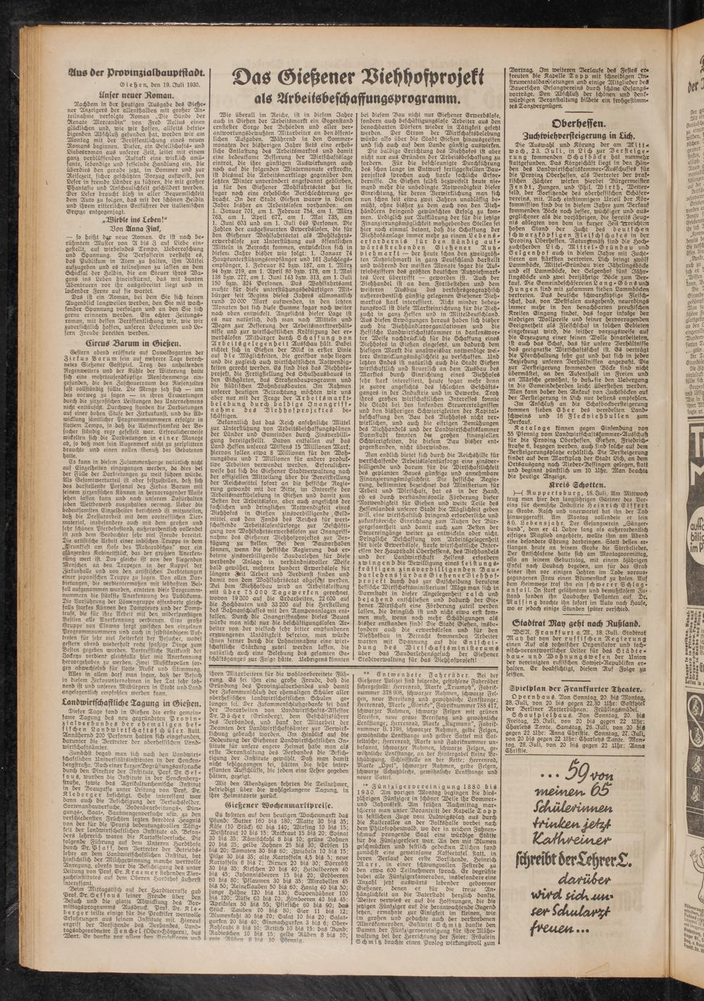 bei diesem Dau nicht nur Gießener Erwerbslose, sondern auch beschäftigungslose Arbeiter aus den benachbarten Dörfern wieder in Tätigkeit gesetzt werden. Der Strom der Wirtschaftsbelebung würde also über die Stadt Gießen hinausgreifen und sich auch auf dem Lande günstig auswirken.