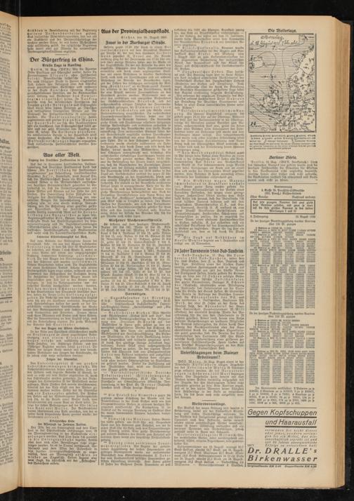 Lufttemperaturen am 18. August: m.ttags 22,7 Grad Celsius, abends 16,7 Grad: am 16. August: morgens 15,7 Grad. Maximum 22,7 Grad, Minimum 13,8 Grad. Erdtemperaturen m 10 cm Tiefe am 18. August: abends 20,2 Grad, am 19. August, morgens 16,2 Grad Celsius. — Niederschlag 0,6 Millimeter. — Sonnenscheindauer 8 Stunden.