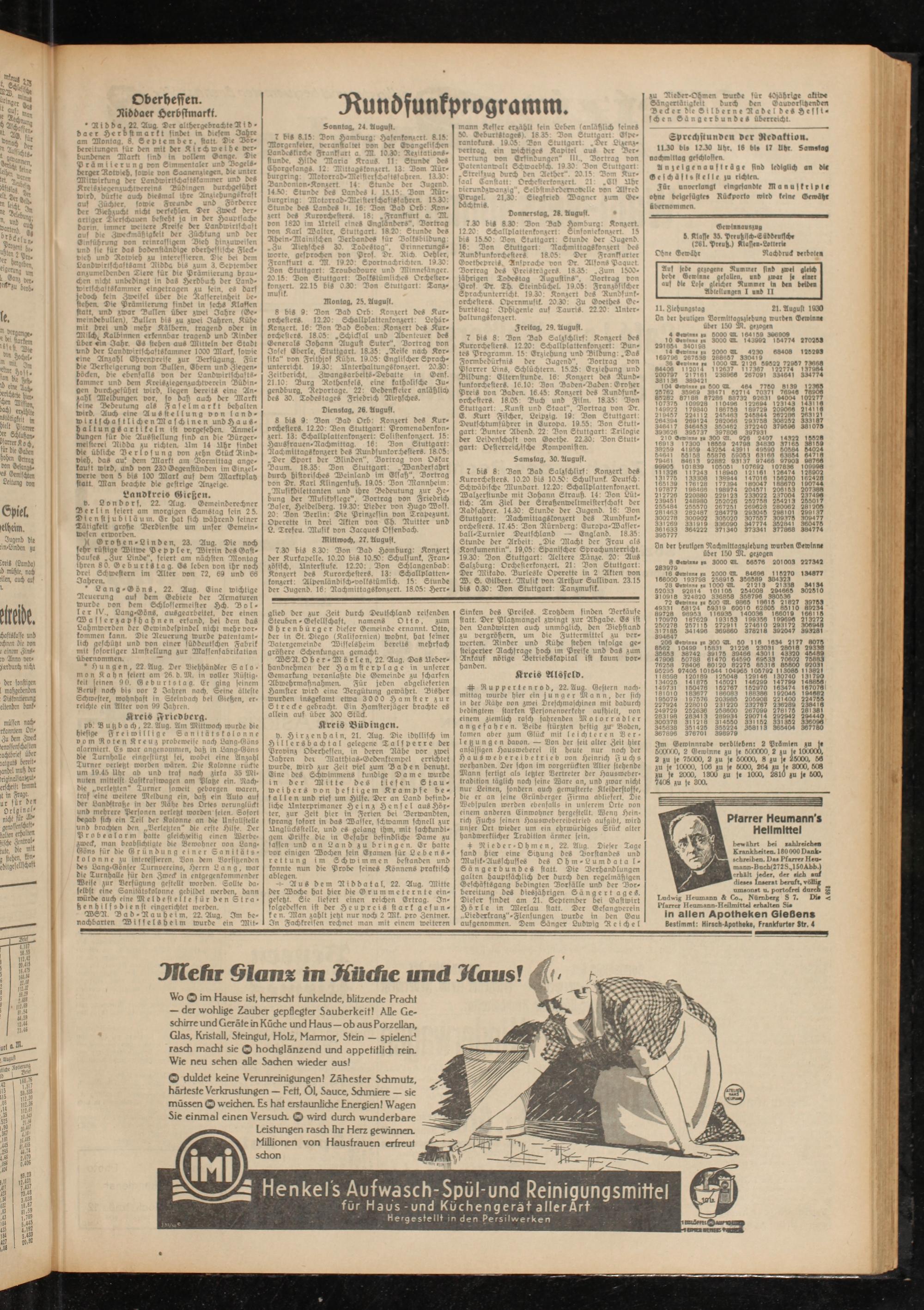 Aus dem Niddatal, 22. Aug. Mitte der Woche hat hier die Grummeternte eingesetzt. Sie liefert einen reichen Ertrag. Infolgedessen ist der Heupreis stark gesunken. Man zahlt jetzt nur noch 2 Mk. pro Zentner. In Fachkreisen rechnet man mit einem weiteren