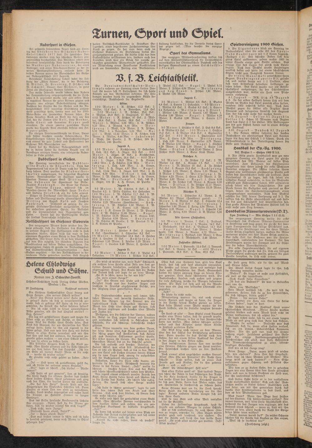 50 Meter: 1. W. Schäfer, 6 Sek.; 2. W. Paulus 6,2; 3. Willy Schäfer, 6,4 Sekunden. — 100 Meter: 1. W. Schäfer 11,7 Sek.: 2. W. Paulus 12,2; 3. K. Simon 12,3 Sekunden. — 800 Meter: 1. K. Simon 2,25 Min.; 2. W. Schäfer 2,25 Minuten (Handbreite). — Hoch- sprung: 1. W. Schäfer 1,30 Meter; 2. W. Paulus 1,15; 3. K. Simon 1,05 Meter. — Speer: 1. K. Simon 25 Meter; 2. W. Paulus 24,51; 3. W. Schäfer 21,68 Meter. — Kugel: 1. W. Schäfer 10,75 Meter; 2. K. Simon 8,90; 3. W. Paulus 8,59 Meter. — Dreikampf: 1. W. Schäfer 88 Punkte; 2. W. Paulus 71 P.; 3. K. Simon 65 Punkte.