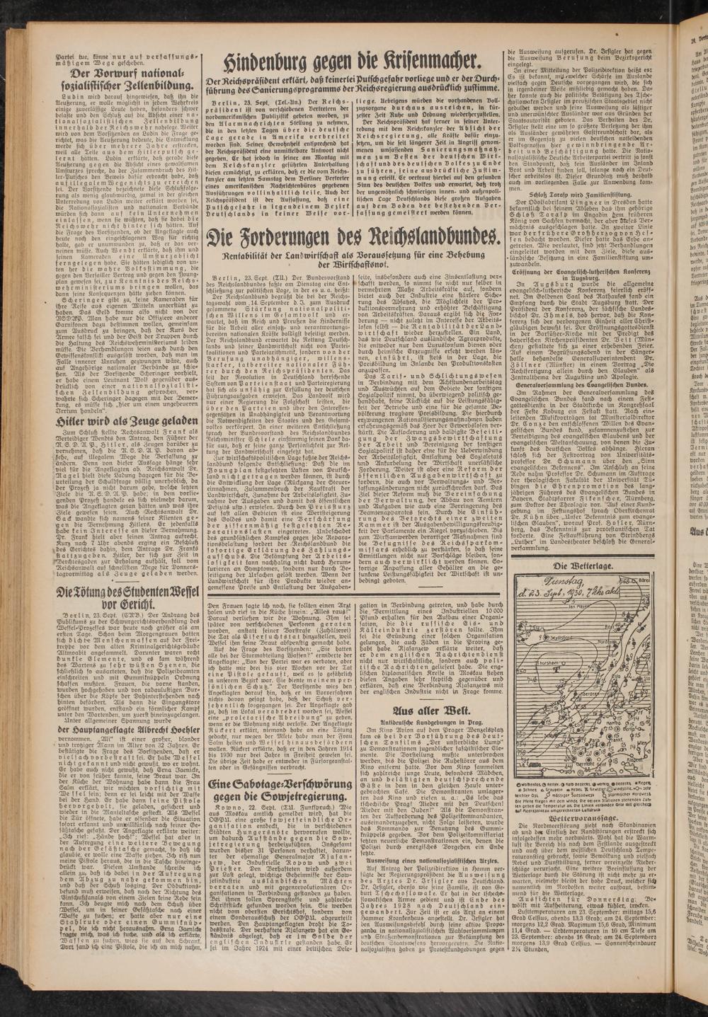 Lufttemperaturen am 23. September: mittags 15,6 Grad Celsius, abends 13,3 Grad; am 24. September: morgens 12,2 Grad. Maximum 15,6 Grad, Minimum 11,4 Grad. — Erdtemperaturen in 10 cm Tiefe am 23. September: abends 16 Grad; am 24. (Septembers morgens 13,9 Grad Celsius. — Sonnenscheindauer 2)4 Stunden,