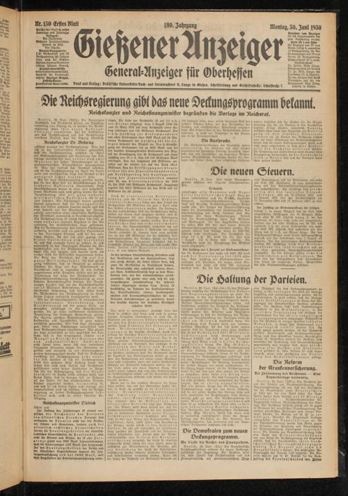 Die Reichsregierung gibt das neue Deckungsprogramm bekannt.
