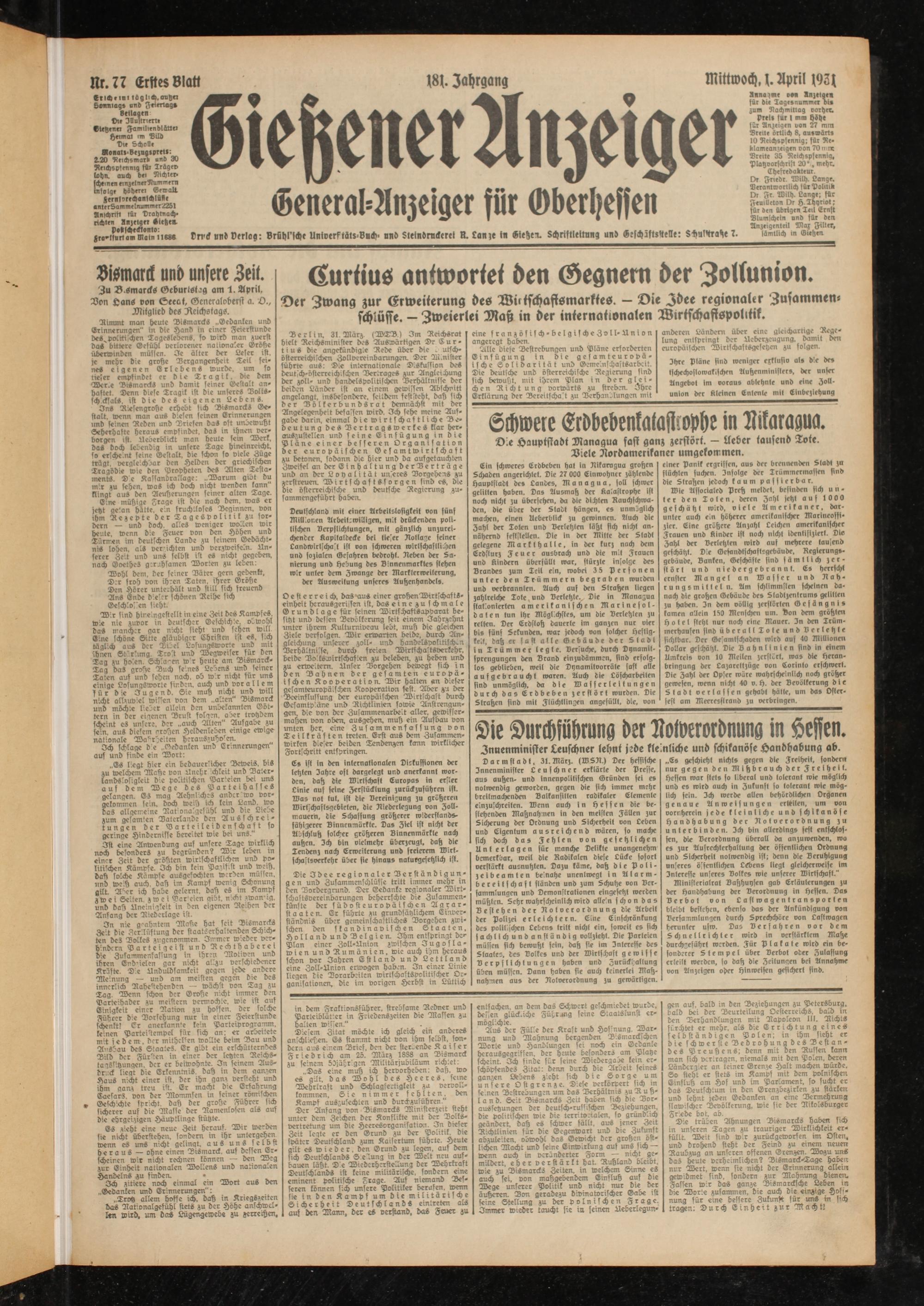 Dt Fnedr. Wilh. Lange. Derantwortlich für Politik Dr Fr. Wilh. Lange; für Feuilleton Dr H. Thyriot; für den übrigen Teil Ernft Dlumlchetn and für den Anzeigenteil Max Filier, sämtlich in Giesten