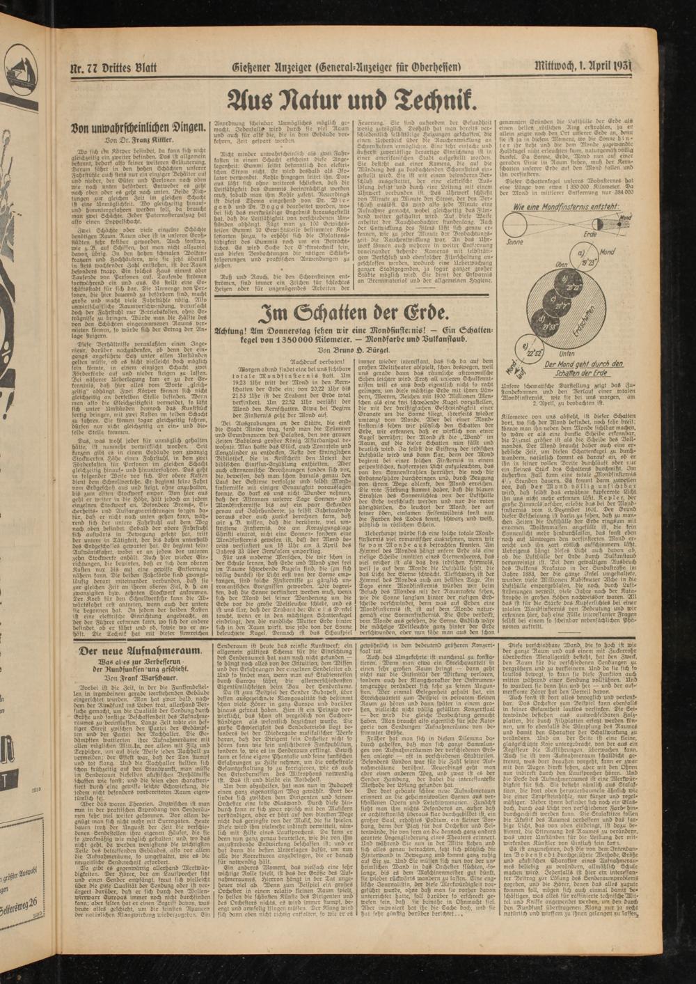 Bei Ausgrabungen an der Stätte, die einst die Stadt Rinive trug, fand man die Trümmer und Grundmauern des Palastes, den vor grauen Zeiten Babylons großer König Assurbanipal bewohnte. Man hatte das Glück, auch Tontafeln und Tonzylinder zu entdecken, Reste der köninglichen Bibliothek, die in Keilschrift den Urtext der biblischen Sintflut-Erzählung enthielten. Aber auch astronomische Berechnungen fanden sich vor, die beweisen, daß man schon damals genau den Lauf der Gestirne verfolgte und selbst Mondfinsternisse mit einiger Genauigkeit Voraussagen konnte. So darf es uns nicht Wunder nehmen, daß der Astronom unserer Tage Sonnen- und Mondfinsternisse bis auf ein paar Sekunden genau auf Iahthunbette, ja selbst Iahrtausende voraus oder auch zurück berechnen kann, daß wir z. B. wissen, daß die berühmte, viel umstrittene Finsternis, bie am Kreuzigungsiaze Christi eintrat, nicht eine Sonnen- sondern eine Mondfinsternis gewesen ist, daß der Mond bereits verfinstert um 18 Uhr am 3. April des Iahres 33 über Ierusalem emporstieg.