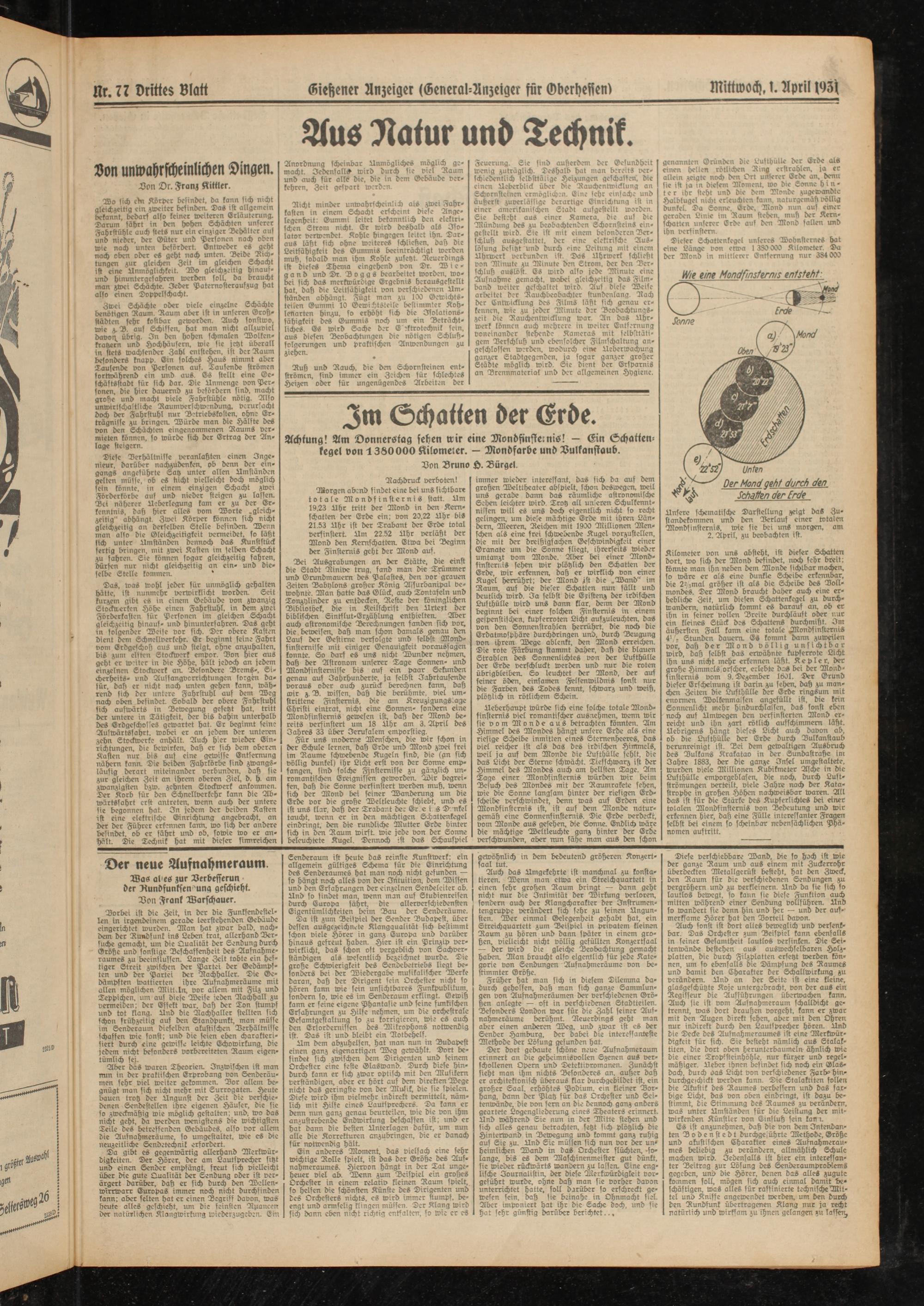 Für uns moderne Menschen, die wir schon in der Schule lernen, daß Erde und Mond zwei frei im Raume schwebende Kugeln sind, die (gn sich völlig dunkel) ihr Licht erst von der Sonne empfangen, sind solche Finsternisse zu gänzlich un- romantischen Ereignissen geworden. Wir begreifen, daß die Sonne verfinstert werden muh, wenn sich der Mond bei seiner Wanderung um die Erde vor die große Weltleuchte schiebt, und es ist uns klar, daß der Trabant bet ©r.c i s D nke l taucht, wenn er in den mächtigen Schattenkegel einbringt, ben bie runbliche Mutter Erde hinter sich in ben Raum wirst, wie jebe von ber Sonne beleuchtete Kugel. Dennoch ist bas Schauspiel