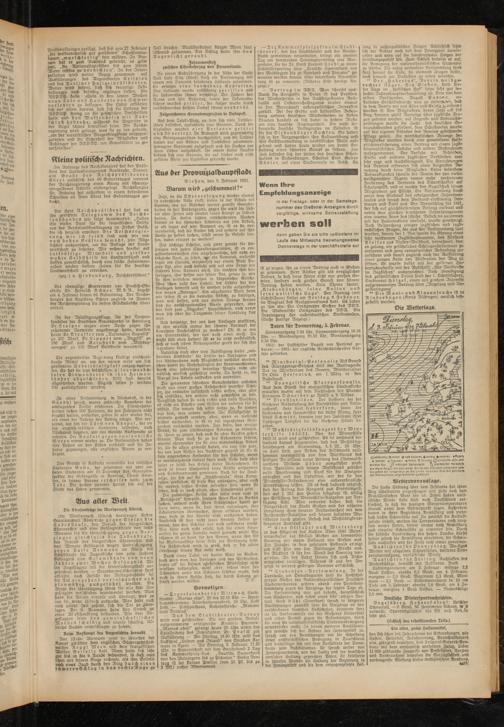 Die flache Störung über dem Festlande hat ihren Weg südostwärts eingeschlagen und zieht nach dem Mittelländischen Meer hin ab. Dabei haben nordöstliche Winde kalte Luft nach Deutschland verfrachtet, so daß die heutigen Morgentemperaturen überall unter dem Gefrierpunkt lagen. Außerdem traten in ihrer Begleitung Bewölkung und mehr- fach leichte Schneefälle auf. Da zunächst die Kaltluft- zufuhr anhält, werden die Temperaturen noch lang, fam weiter sinken, ferner immer noch Bewölkung und einzelne Schneefälle zu erwarten fein. Durch die südliche Ausbreitung des hohen Druckes dürfte später jedoch die Bewölkung abnehmen, die Schneefälle nachlassen und der Frost noch etwas zunehmen.