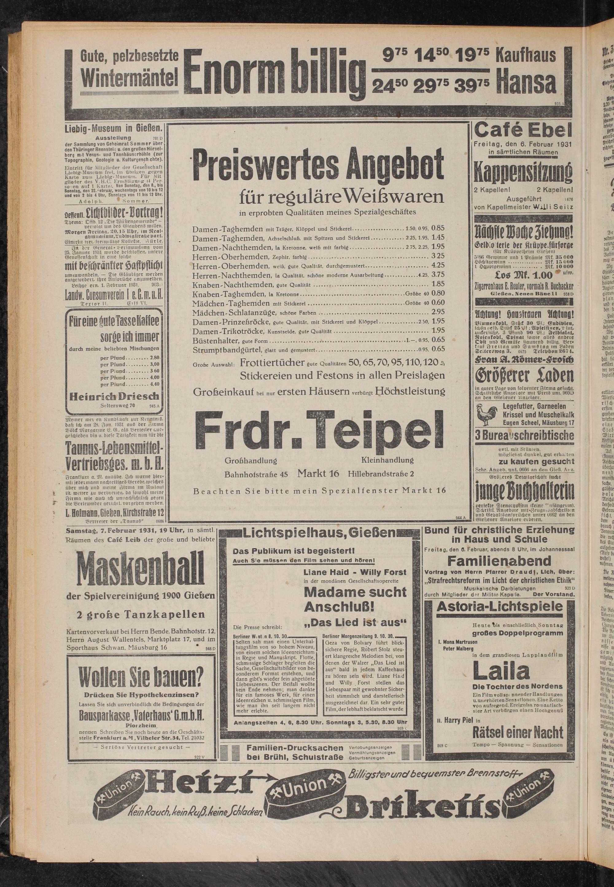 Freitag, den 6. Februar 1931 in sämtlichen Räumen