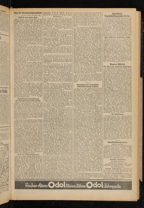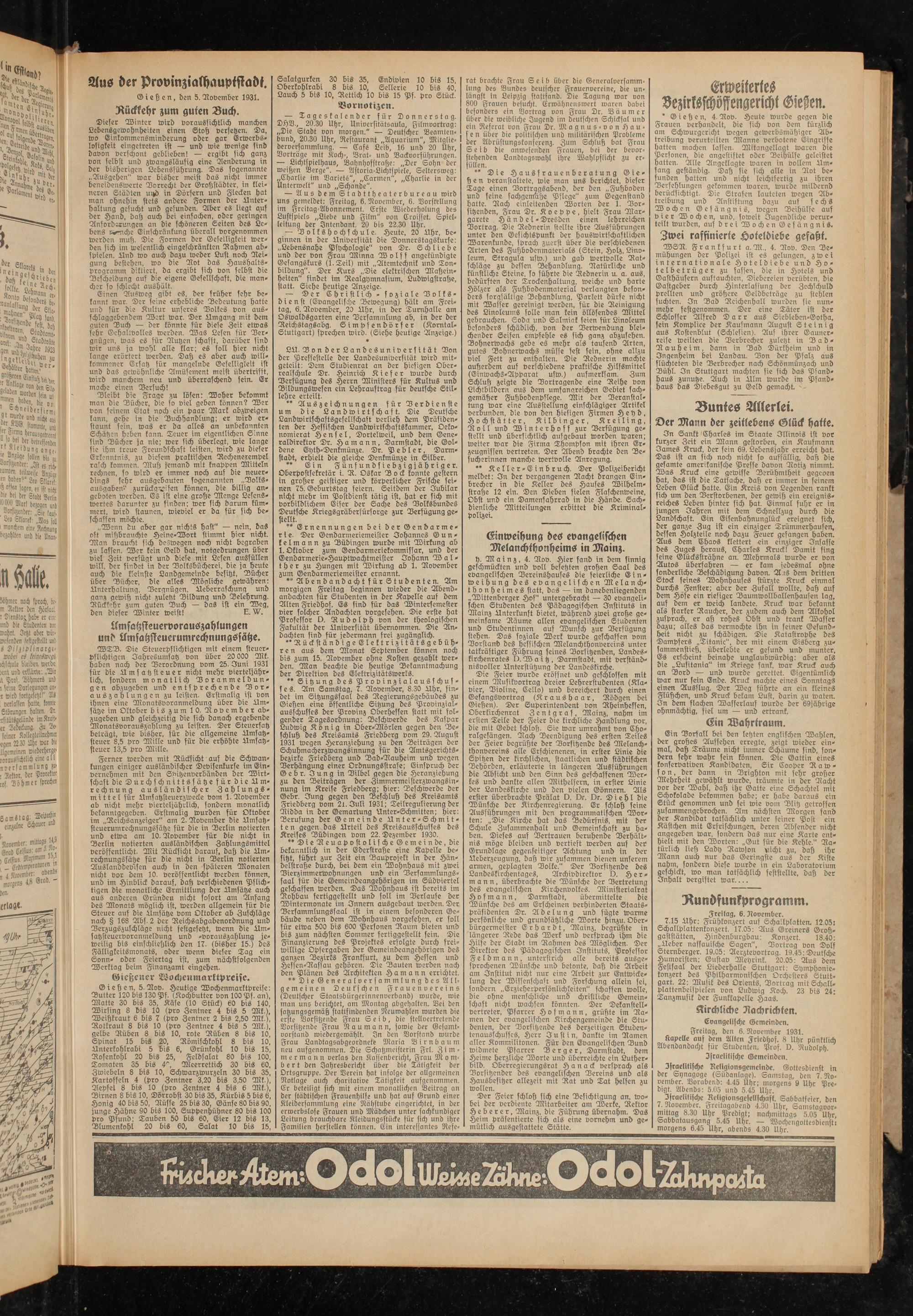 ** Sitzung des Provinzialausschus- s e s. Am Samstag, 7. November, 8.30 Uhr, findet im Sitzungssaal des Regierungsgebäudes zu Gießen eine öffentliche Sitzung des Provinzialausschusses der Provinz Oberhessen statt mit folgender Tagesordnung: Beschwerde des Kaspar Ludwig König in Ober-Mörlen gegen den Beschluß des Kreisamts Friedberg vom 29. August 1931 wegen Heranziehung zu den Beiträgen der Schuhmacherzwangsinnung für die Amtsgerichtsbezirke Friedberg und Bad-Nauheim und wegen Verhängung einer Ordnungsstrafe: Einspruch der Gebr. Jung in Vilbel gegen die Heranziehung zu den Beiträgen der Zimmermeisterzwangsinnung im Kreise Friedberg: hier: Beschwerde der Gebr. Jung gegen den Beschluß des Kreisamts Friedberg vom 21. Sufi 1931; Teilregulierung der Nidda in der Gemarkung Unter-Schmitten: hier: Berufung der Gemeinde Unter-Schmit- t e n gegen das Urteil des Kreisausschusses des Kreises Büdingen vom 22. Dezember 1930.