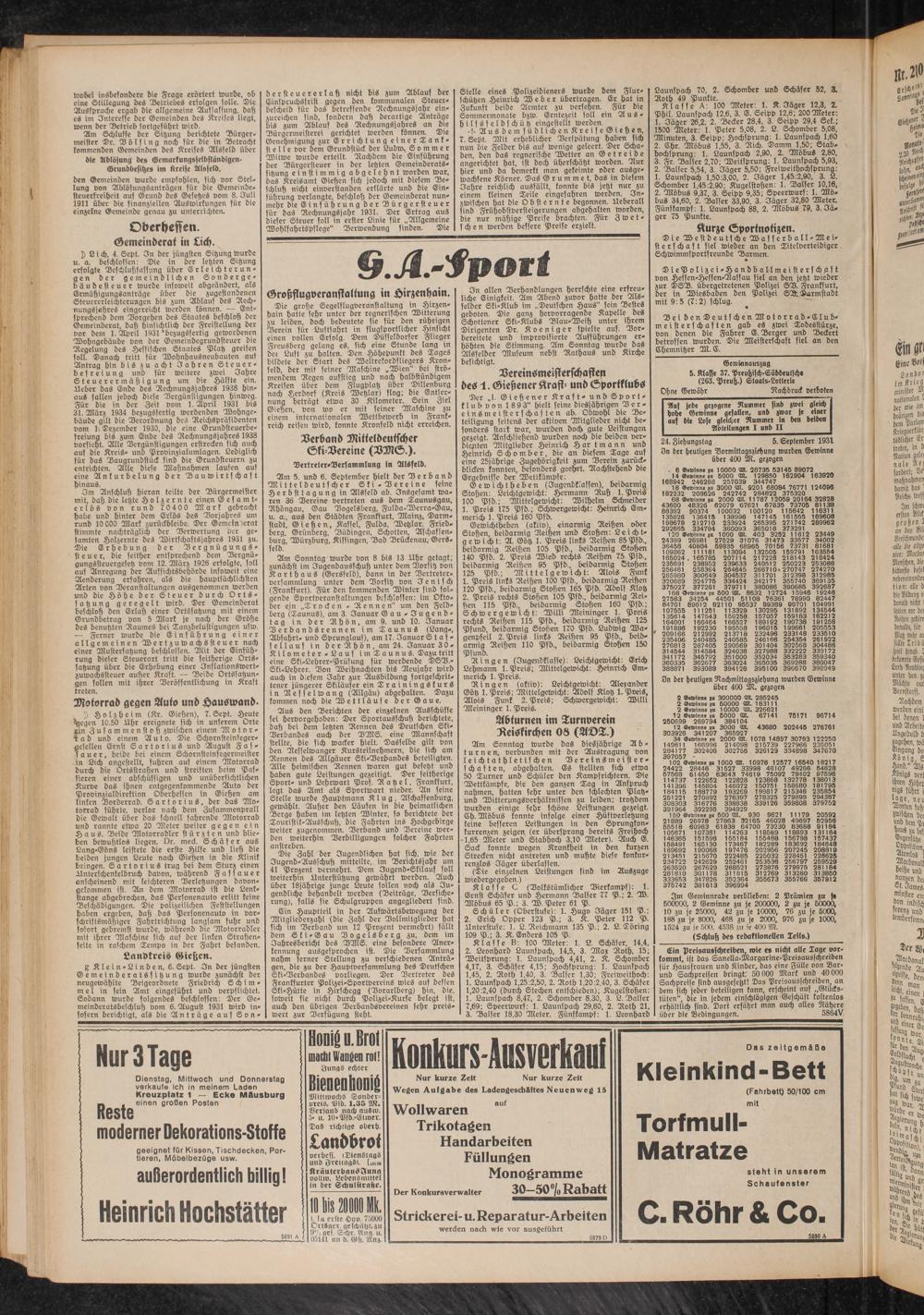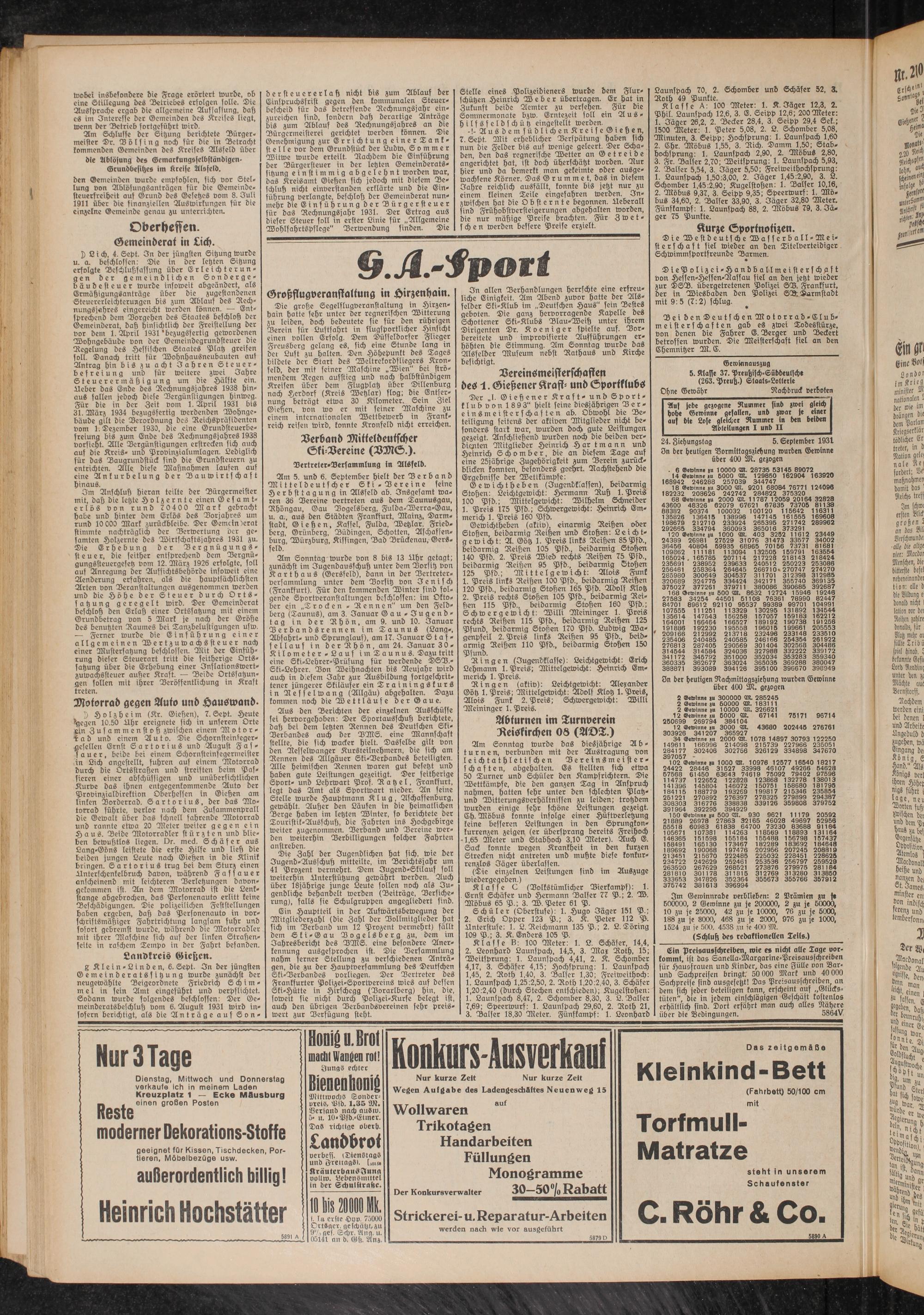Klasse A: 100 Meter: 1. K. Jäger 12,3, 2. Phil. Launspach 12,6, 3. E. Seipp 12,6; 200Meter: 1. Jäger 26,2, 2. Becker 28,4, 3. Seipp 29,4 Sek.; 1500 Meter: 1. Peter 5,08, 2. L. Schomber 5,08, Minuten, 3. Seipp; Hochsprung: 1. Launspach 1,60 2. Ehr. Möbus 1,55, 3. Rich. Damm 1,50; Stabhochsprung: 1. Launspach 2,90, 2. Möbus 2,80, 3. Fr. Balser 2,70; Weitsprung: 1. Launspach 5,93. 2. Balser 5,54, 3. Jäger 5,50; Fretweithochsprung: 1. Launspach 1,50:3,00, 2. Jäger 1,45:2,90, 3. L. Schomber 1,45:2,90; Kugelstoßen: 1. Balser 10,16, 2. Möbus 9,37, 3. Seipp 9,35; Speerwurf: 1. Möbus 34,60, 2. Balser 33,90, 3. Jäger 32,80 Meter. Fünfkampf: 1. Launspach 88, 2. Möbus 79, 3. Jäger 75 Punkte.