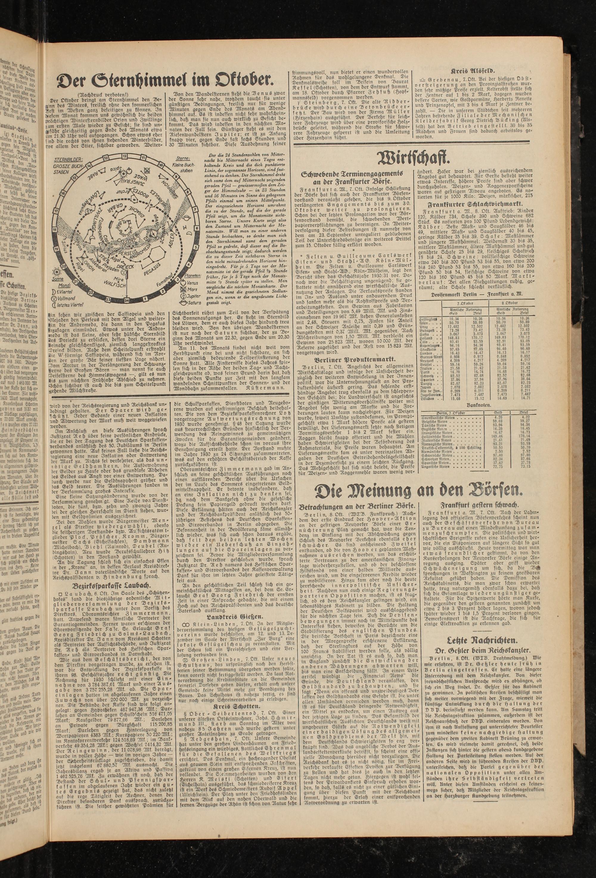 Der Oktober bringt am Sternhimmel ben Beginn des Winters, freilich ohne den sommerlichen Best im Westen ganz beseitigen zu können. 3n taefem Monat kommen uns gewöhnlich die beiden prächtigen Wintersternbilder Orion unb Zwillinge jum ersten Male wieber zu Gesicht; sie sinb ungefähr gleichzeitig gegen Snbe bes Monats etwa um 21.30 Uhr voll auf gegangen. Schon etwas eher s mb bie rechts von ihnen stehenden Winterbilder, t?or allem ber Stier, sichtbar geworben. Weiter-