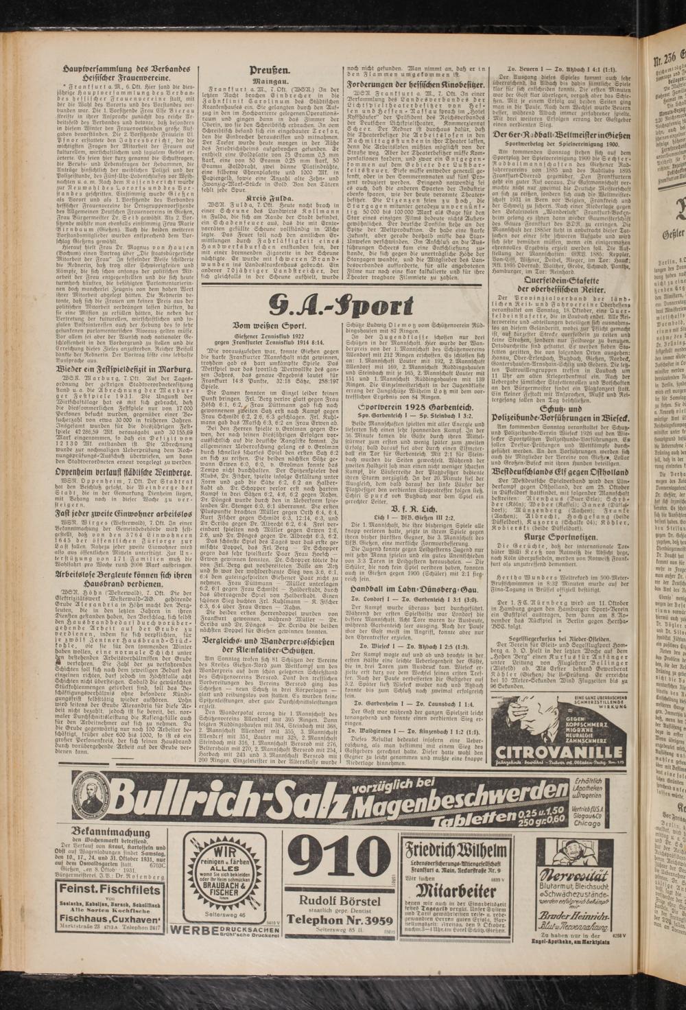Beide Mannschaften spielten mit aller Energie und lieferten sich einen sehr spannenden Kampf. In der 36. Minute kamen die Gäste durch ihren Mittelstürmer zum ersten und wenig später zum zweiten Erfolg; bald darauf fiel aber durch einen (Elfmeter- ball ein Tor für Garbenteich Mit 2:1 für Stein- bad) wurden die Seiten gewechselt. Während der zweiten Halbzeit sah man einen nicht weniger scharfen Kamps, die Läuferreihe der Platzbesitzer bediente ihren Sturm vorzüglich. In der 20. Minute fiel der Ausgleich, dem bald darauf der linke Läufer der Platzbesitzer den verdienten Siegestreffer folgen ließ. Schiri S p u r ck ooh Butzbach war dem Spiel ein gerechter Leiter.