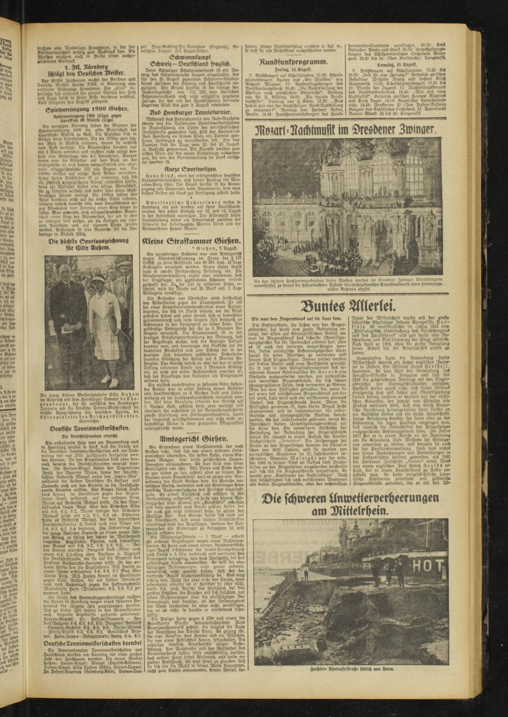 Die Internationalen Tennismeisterschaften von Deutschland wurden am Sonntaa vor einer groben Zahl von Zuschauern beendet- Die neuen Meister heißen: Herren Einzel: Menzel (Deutfch-Böhmen). Damen-Einzel: Lilly Außem (Köln). Herren-Doppel: Dr. Dessart/Rourney (Hamdurg/Koln), Damen-Dop-