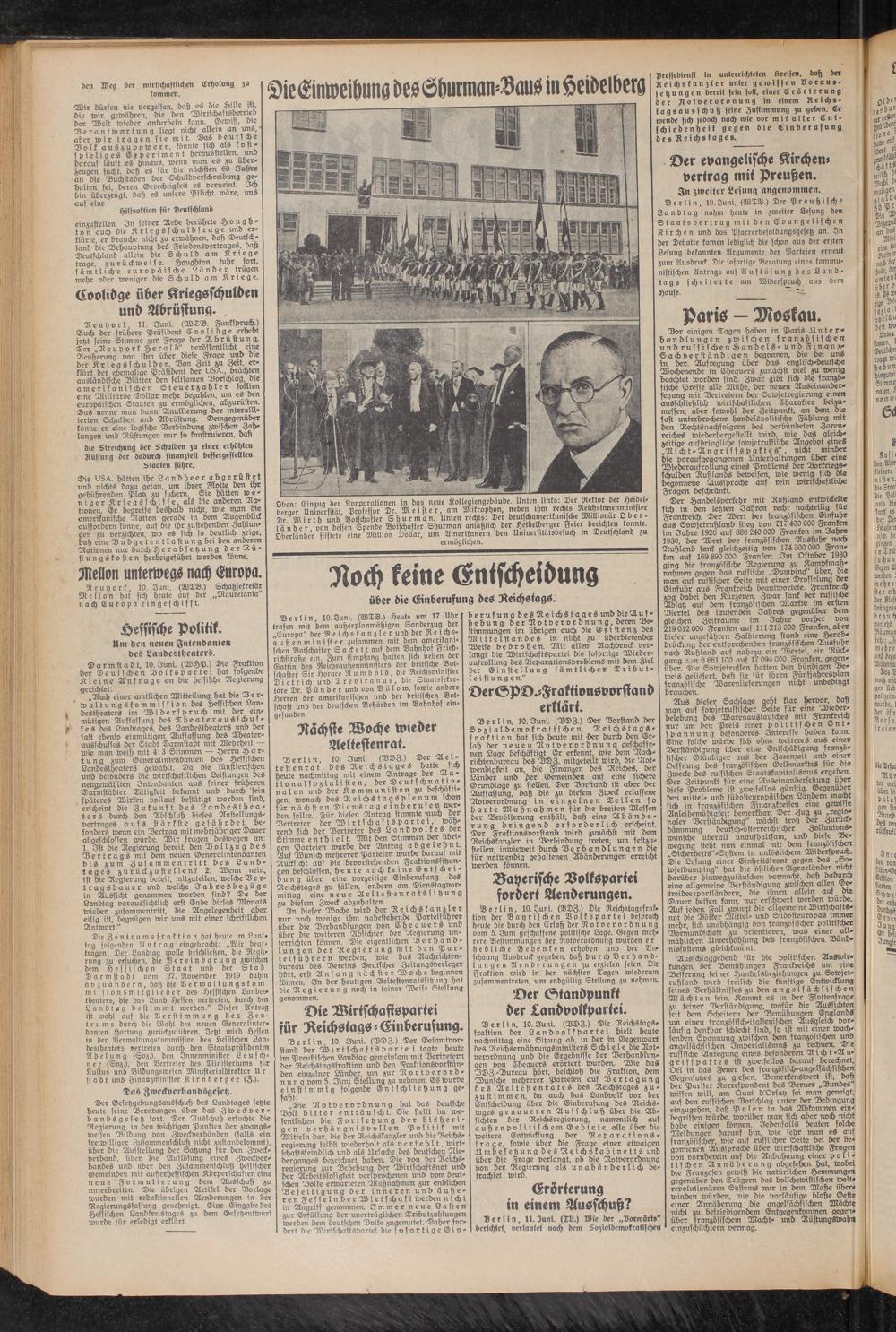Oben- Einzug der Korporationen in das neue Kollegiengebäude. Unten links: Der Rektor der Heidel- berae'r Universität Professor Dr. M e i st e r, am Mikrophon, neben ihm rechts Reichsinnenminister Dr ^W i r th und Botschafter S hur man. Unten rechts: Der deutschamerikanllche Millionär Ober- lü'nder, von dessen Spende Botschafter Shurman anläßlich der Heidelberger Feier berich en konnte Oberländer stiftete eine Million Dollar, um Amerikanern den Universitatsbesuch m Deutschland zu ermöglichen.