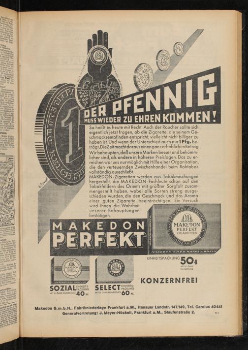 Makedon G.m.b.H., Fabrikniederlage Frankfurt a.M., Hanauer Landstr. 147/149, Tel. Carolus 40441 Generalvertretung: J. Meyer-Höckell, Frankfurt a.M.» Staufenstraße 2.