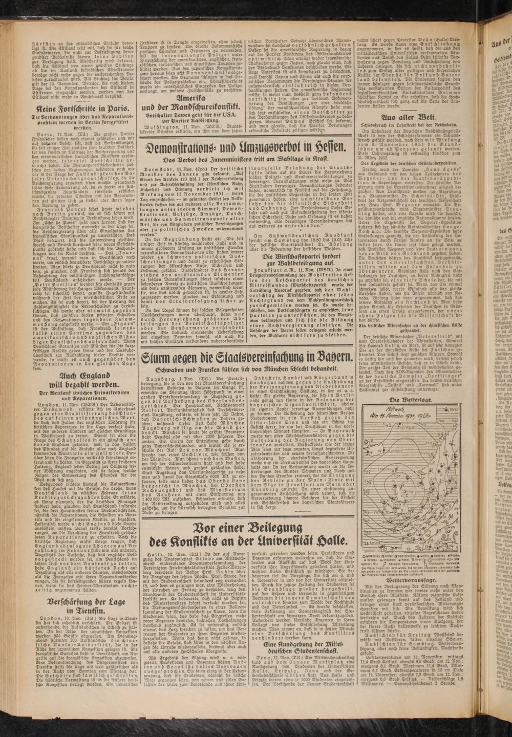 Darmstadt, ll.Rov. (Lpd.) Der hessische Minister de» Innern gibt bekannt: „Aus Grund des Artikels 123 Abs. 2 der Reichsverfassung und zur Aufrechterhaltung der öffentlichen Ruhe, Sicherheit und Ordnung verbiete ich mit Mirkung vom 15. Rooember 1931 — die en lag eingeschiossen — im gesamten Gebiet des voiks- flaalce Hessen bi» auf weiteres alle Versammlungen unter freiem Himmel, Demonstrationen, Aufzüge, Umzüge, Durchmärsche und Sammeltransporte aller Art, die von Mitgliedern politischer Vereinigungen oder zu politischen Zwecken unternommen werden."