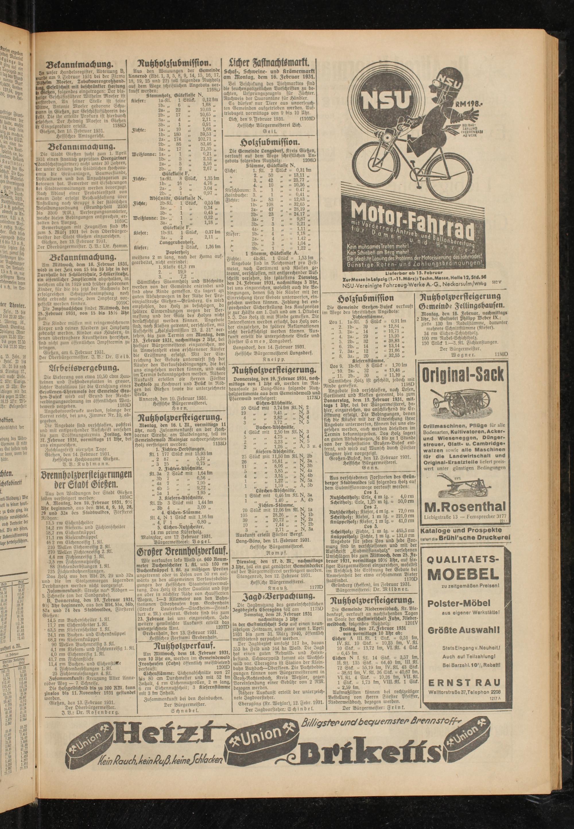 B Donnerstag, den 19. Februar 1931, 9^ Uhr beginnend, aus den Abt. 55a, 56b, 57a und 74 des Stadlwalde», Försterei Gießen: