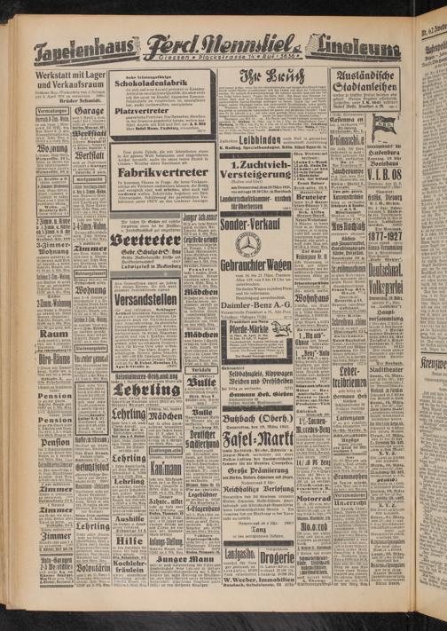 Es kommen Herren in Frage, die beste Verkaufs- erfolge als Vertreter nachweisen können, die fleißig und energisch sind, viel arbeiten, aber auch viel verdienen wollen. Schriftliche Angebote mit Bild, Altersangabe, Schilderung der persönlichen Verhältnisse unter 1927V an den Gießener Anzeiger.