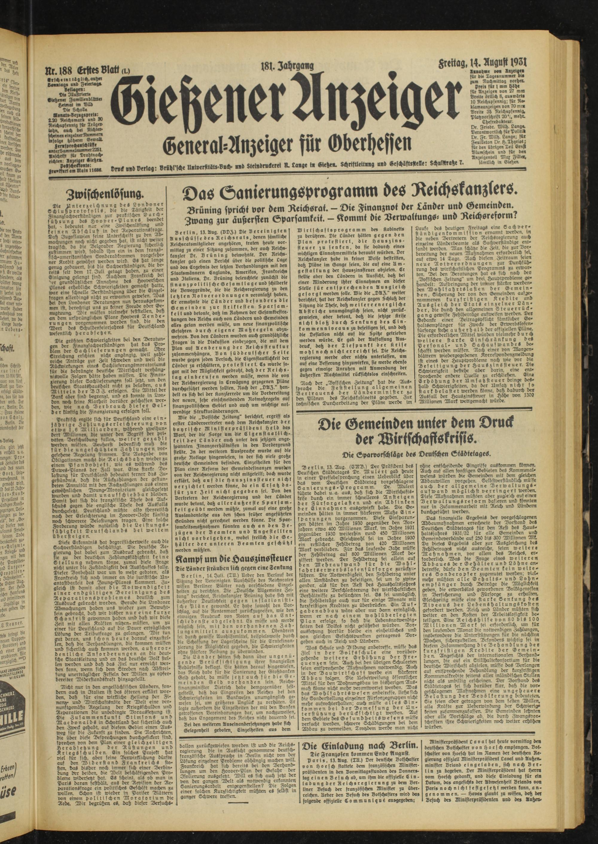 Brüning spricht vor dem Reichsrat. - Die Finanznot der Länder und Gemeinden. Zwang zur äußersten Sparsamkeit. - Kommt die Verwaltungs- und Reichsreform/