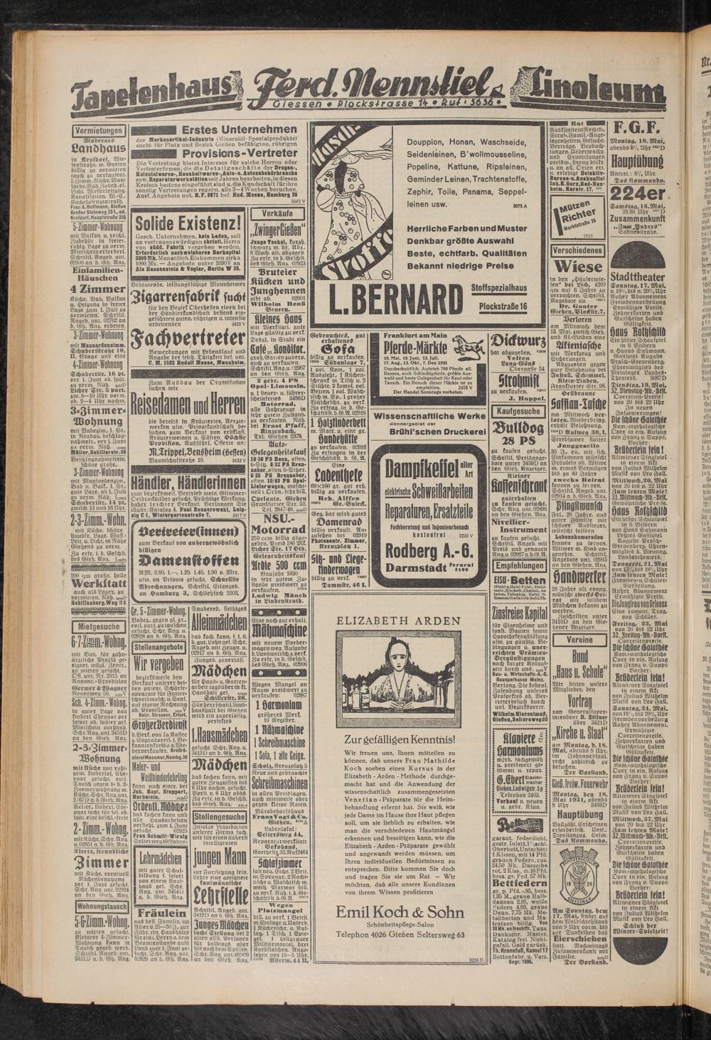 Wir freuen uns, Ihnen mitteilen zu können, daß unsere Frau Mathilde Koch soeben einen Kursus in der Elizabeth - Arden - Methode durchgemacht hat und die Anwendung der wissenschaftlich zusammengesetzten Vene tian - Präparate für die Heimbehandlung erlernt hat Sie weiß, wie jede Dame im Hause ihre Haut pflegen soll, um sie lieblich zu erhalten, wie man die verschiedenen Hautmängel erkennen und beseitigen kann, wie die Elizabeth - Arden - Präparate gewählt und angewandt werden müssen, um Ihren individuellen Bedürfnissen zu entsprechen. Bitte kommen Sie doch und tragen Sie sie um Rat. — Wir möchten, daß alle unsere Kundinnen von ihrem Wissen profitieren