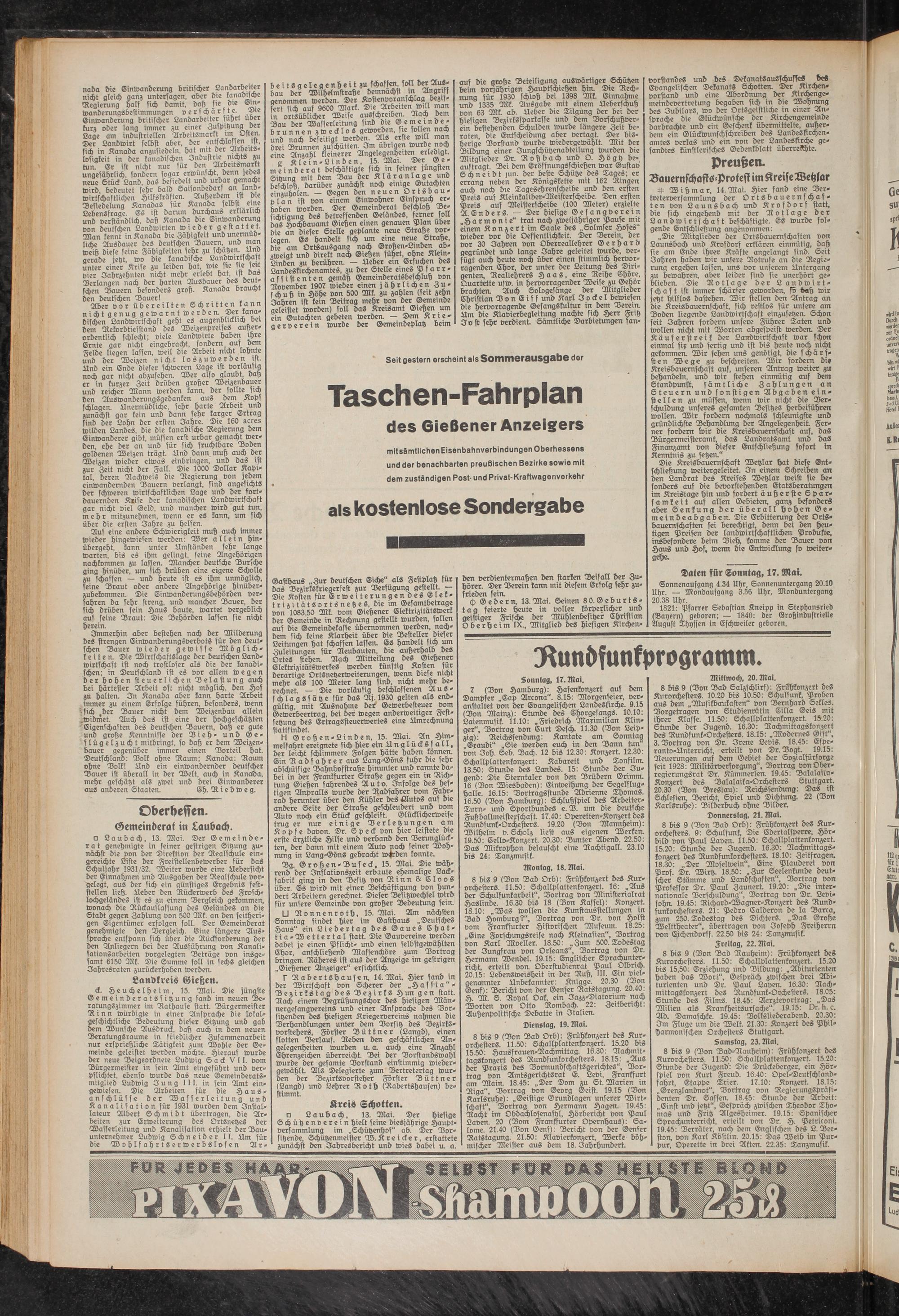 7 (Von Hamburg): Hafenkonzert auf dem Dampfer „Cap Arcona". 8.15: Morgenfeier, veranstaltet von der Evangelischen Landeskirche. 9.15 (Don Mainz): Stunde des Chorgesangs. 10.10: Laienmusik. 11.10: „Friedrich Maximilian Klinger", Vortrag von Curt Desch. 11.30 (Don Leipzig): Reichssendung: Kantate am Sonntag „Exaudi" „Sie werden euch in den Bann tun" von Joh. Seb. Dach. 12 bis 12.30: Konzert. 12.30: Schallplattenkonzert: Kabarett und Tonfilm. 13.50: Stunde des Landes. 15: Stunde der Jugend: Die Stemtaler von den Drüdern Grimm. 16 (Von Wiesbaden): Einweihung der Segelflughalle. 16.15: Vortrags stunde Adrienne Thomas. 16.50 (Von Hamburg): Schlußspiel des Arbeiter- Turn- und Sportbundes e. D. um die deutsche Fußballmeisterschaft. 17.40: Operetten-Konzert des Rundfunk-Orchesters. 19.20 (Von Mannheim): Wilhelm v. Scholz liest aus eigenen Werken. 19.50: Cello-Konzert. 20.30: (Bunter Abend. 22.50: Das Mikrophon belauscht eine Nachtigall. 23.10 bis 24: Tanzmusik.