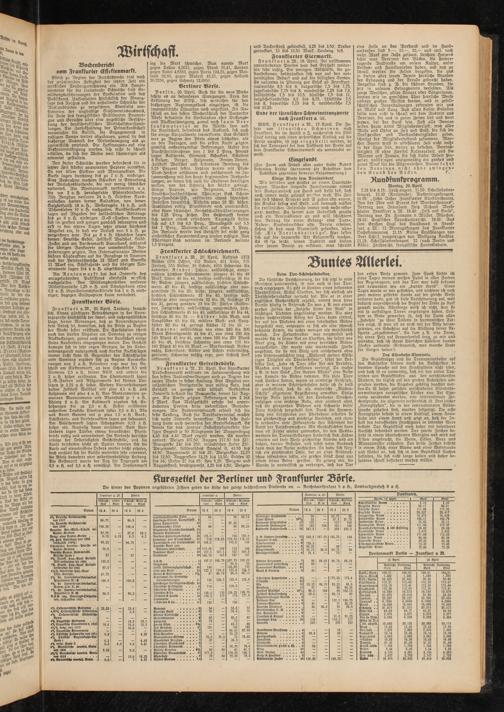 7.15 bis 8.15: Früh.onzert. 11.50: Schallplattenkonzert. 16.30 (Karlsruhe): Rachmittagskonzert. 18.15: „Zehn Jahre Frankfurter Künstlertheater. Von der Idee und Praxis des Wandertheaters", Vortrag von Intendant Fritz Richard Werkhäuser, Frankfurt a. M. 18.40: „Leib und Seele", Vortrag von Dr. Hermann v. Müller, München. 19.10: Englischer Sprachunterricht. 19.35: Aus Dem Großen Saal des Saalbaues in Frankfurt a. OH.: 12. Montagskonzert des Frankfurter Orchestervereins. 21.15: Kleine Erzählungen von Bert Schiff, vorgetragen von Wolfgang Koehler. 21.25: Schallplattenkonzert. 22 (nach Berlin und Köln): Zeitbericht, französische Heeresdebatte.