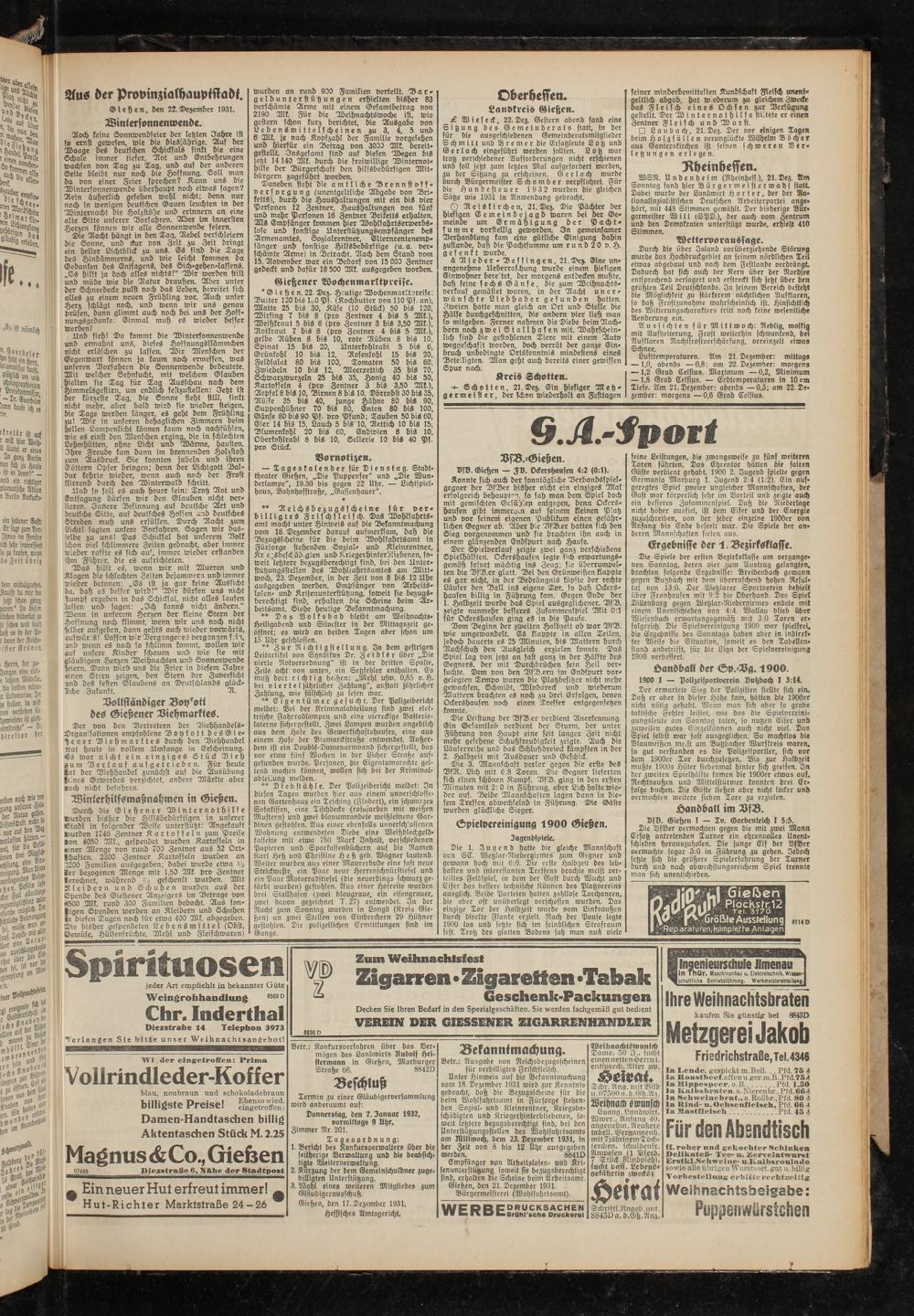Unter Hinweis auf die Bekanntmachung vom 18. Dezember 1931 wird zur Kenntnis gebracht, daß die Bezugsscheine für die beim Wohlfahrtsamt in Fürsorge stehenden Sozial- und Kleinrentner, Kriegsbeschädigten und Kriegerhinterbliebenen, soweit letztere bezugsberechtigt find, bei den Unterstützungsstellen des Wohlfahrtsamts am Mittwoch, dem 23. Dezember 1931, in der Zeit von 8 bis 12 Uhr ausgegeben werden. 8841D