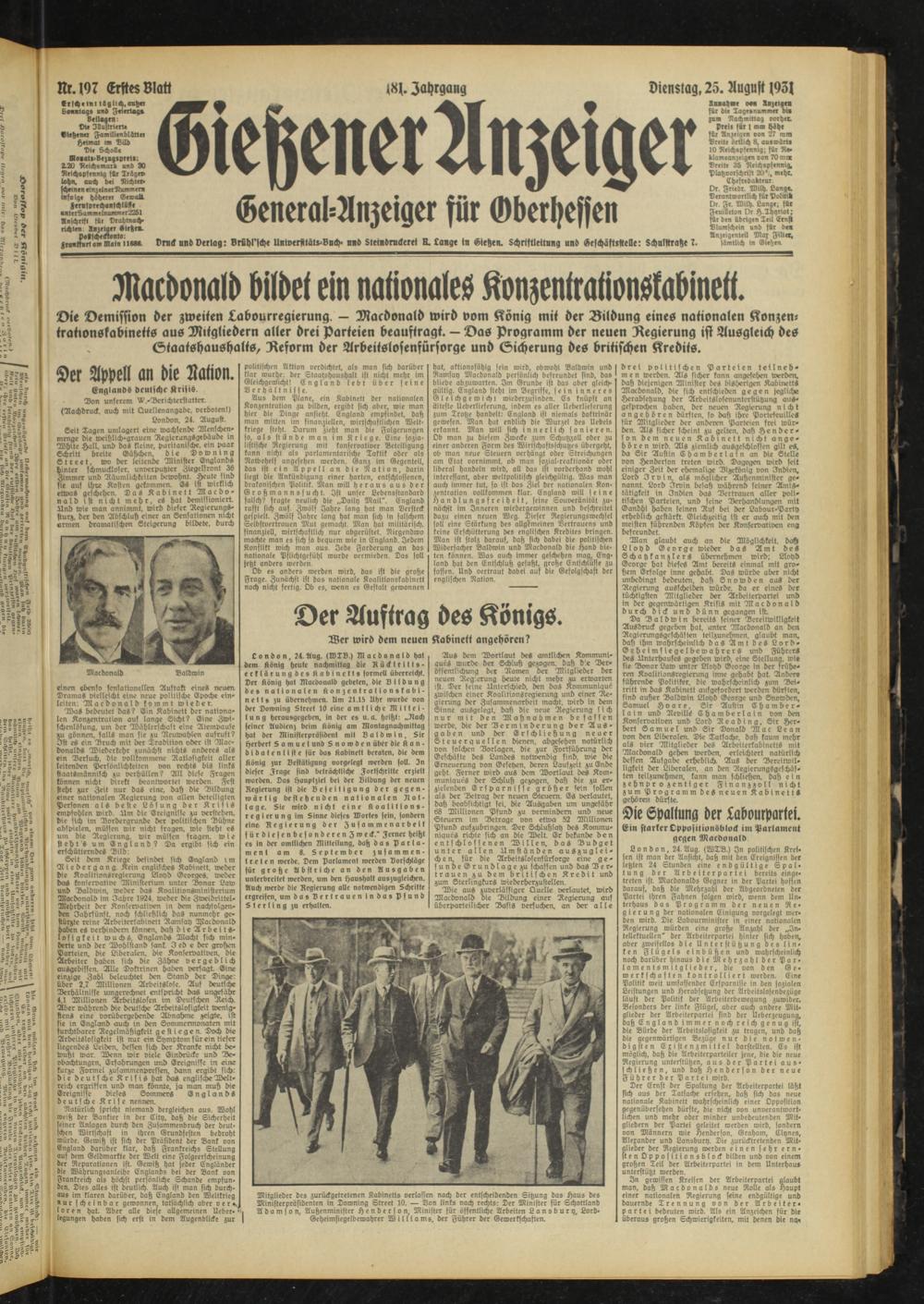 Oie Demission der zweiten labourregterung. — Macdonald wird vom König mit der Bildung eines nationalen Konzentrationskabinetts aus Mitgliedern aller drei Parteien beauftragt. — Das Programm der neuen Regierung ist Ausgleich des Staatshaushalts, Reform der Arbeitslosenfürsorge und Sicherung des britischen Kredits.