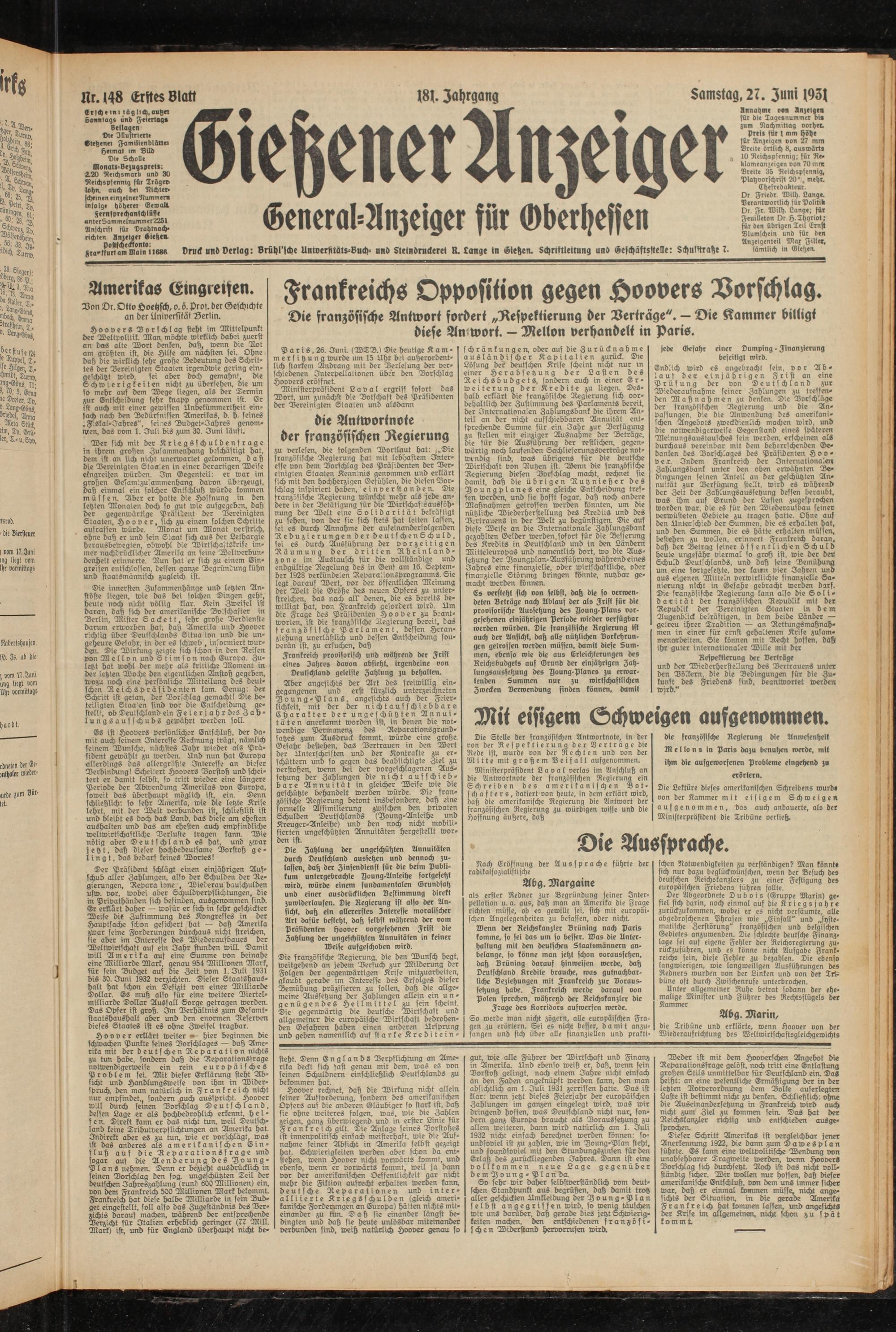 Dieser Schritt Amerikas ist vergleichbar jener Anerkennung 1922, die dann zum Dawesplan führte. Es kann eine weltpolitische Wendung von unabsehbarer Tragweite werden, wenn Hoovers Vorschlag sich durchsetzt. Noch ist das nicht vollständig sicher. Wir wollen nur hoffen, daß dieser amerikanische Entschluß, von dem uns immer sicher war, daß er einmal kommen müsse, nicht angesichts ter Situation, in die gerade Amerika Frankreich bat kommen lassen, und angesichts der Krise im allgemeinen, nicht schon zu spät kommt.
