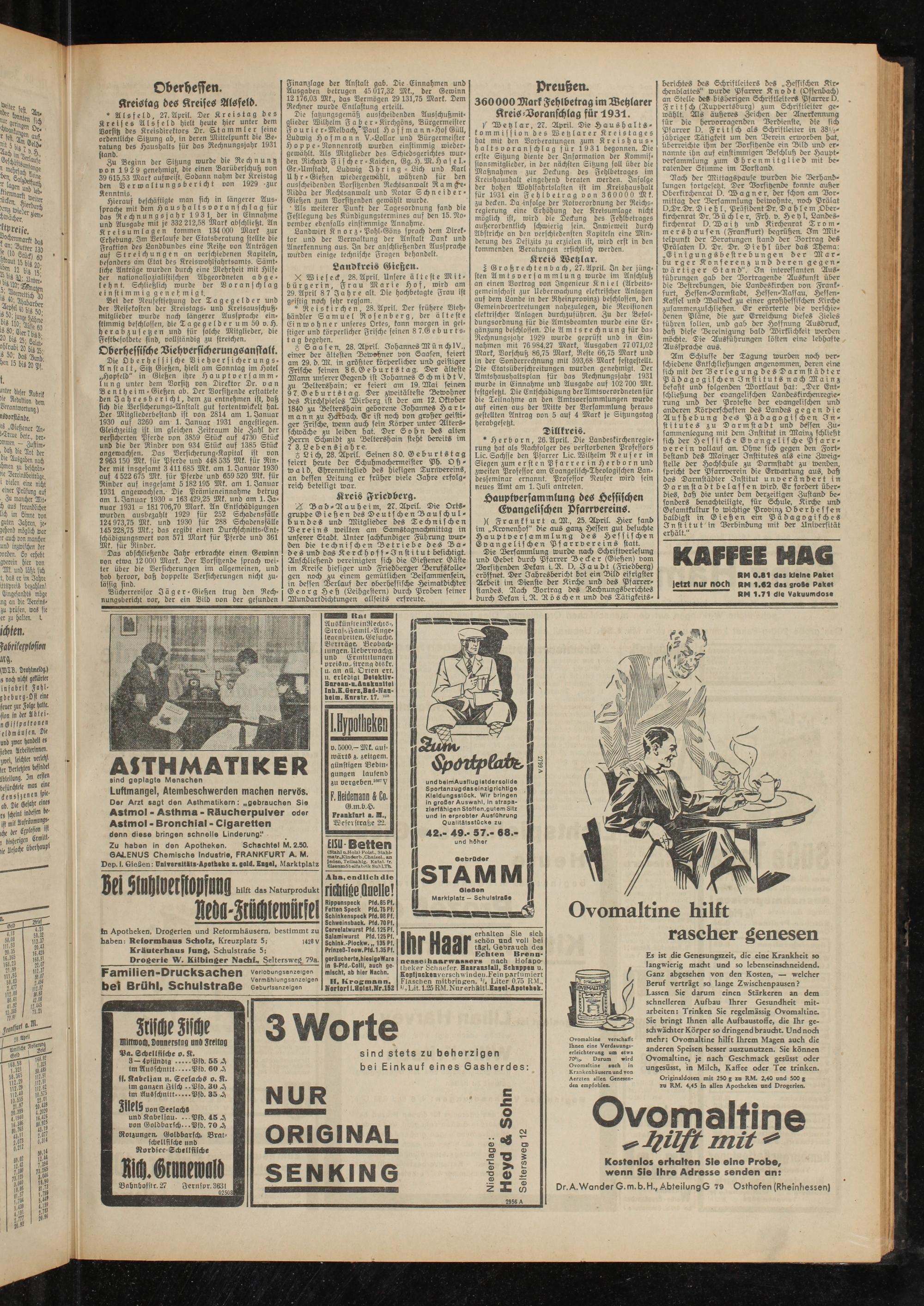 * Alsfeld, 27.April. Der Kreistag des Kreises Alsfeld hielt heute hier unter dem Vorsitz des Kreisdirektors Dr. Stammler feine ordentliche Sitzung ab, in deren Mittelpunkt die Beratung des Haushalts für das Rechnungsjahr 1931 stand. .. m ,