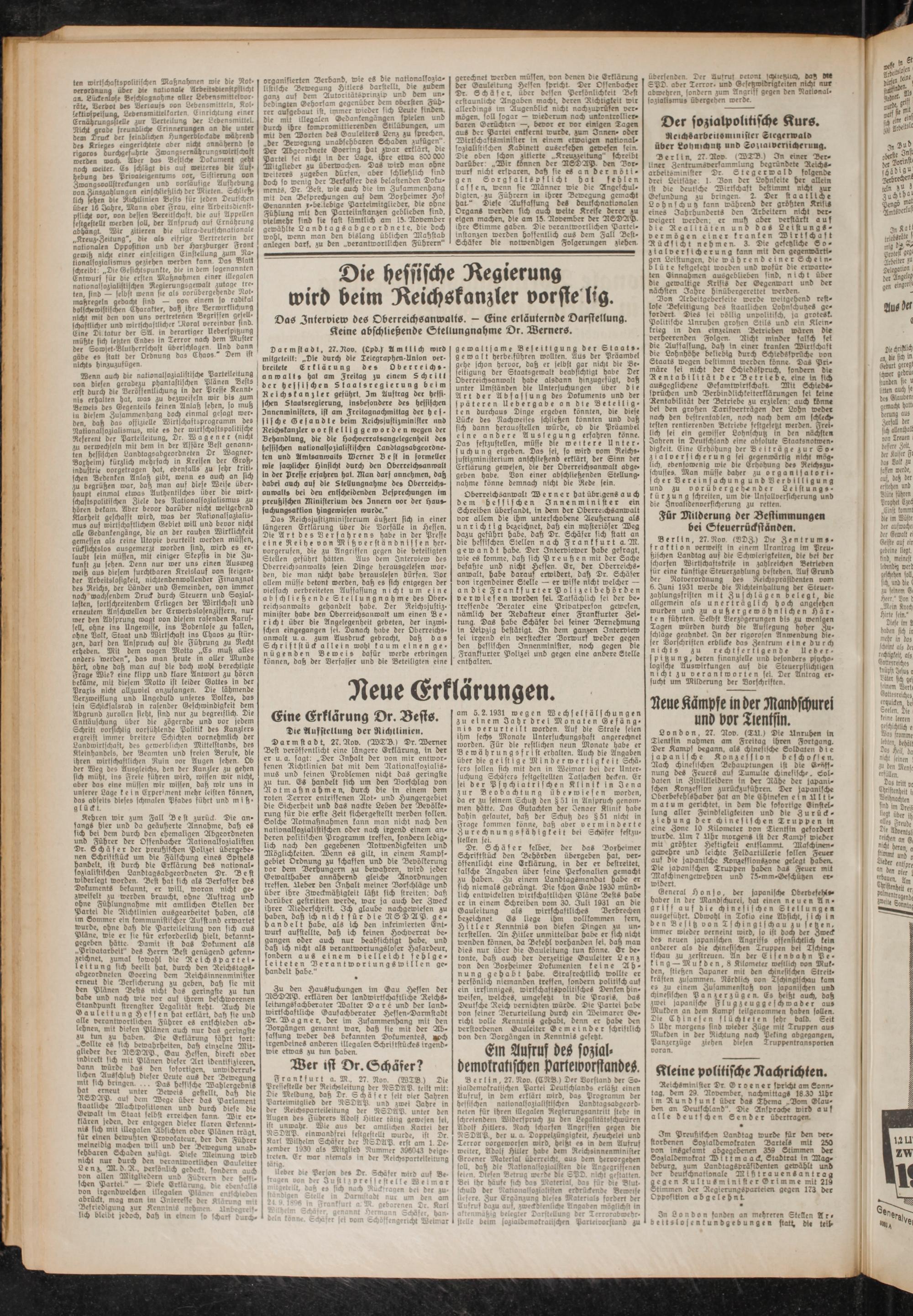 Darmstadt, 27. Roo. (£pö.) Amtlich wird mitgeteilt: „Die durch die Telegraphen-llnion oer- breite le Erklärung des Oberreid)»- anroalt» Hal am Freitag ju einem Schritt der hessischen S t a a 1 s r e g i e r u n g beim Reichskanzler geführt. 3m Auftrag der hessischen Staatsregierung, insbesondere des hessischen 3nnenminister». ist am Freitagnachmittag der hessische Gesandte beim Reichsjustizminister und Reichskanzler vorstellig geworden wegen der Behandlung, die die hochoerralsangelegenheil de» hessischen nationalsozialistischen Landtagsabgeordneten und Amtsanwalt» Werner Best in formeller wie sacylicher Hinsicht durch den Oberreichsanwalt In der Presse erfahren hat. Man darf annehmen, daß dabei auch auf die Stellungnahme de» Oberreich»- anwalls bei den entscheidenden Besprechungen im preußischen Ministerium de» Innern vor der haus- suchungsaktion hingewiesen wurde."
