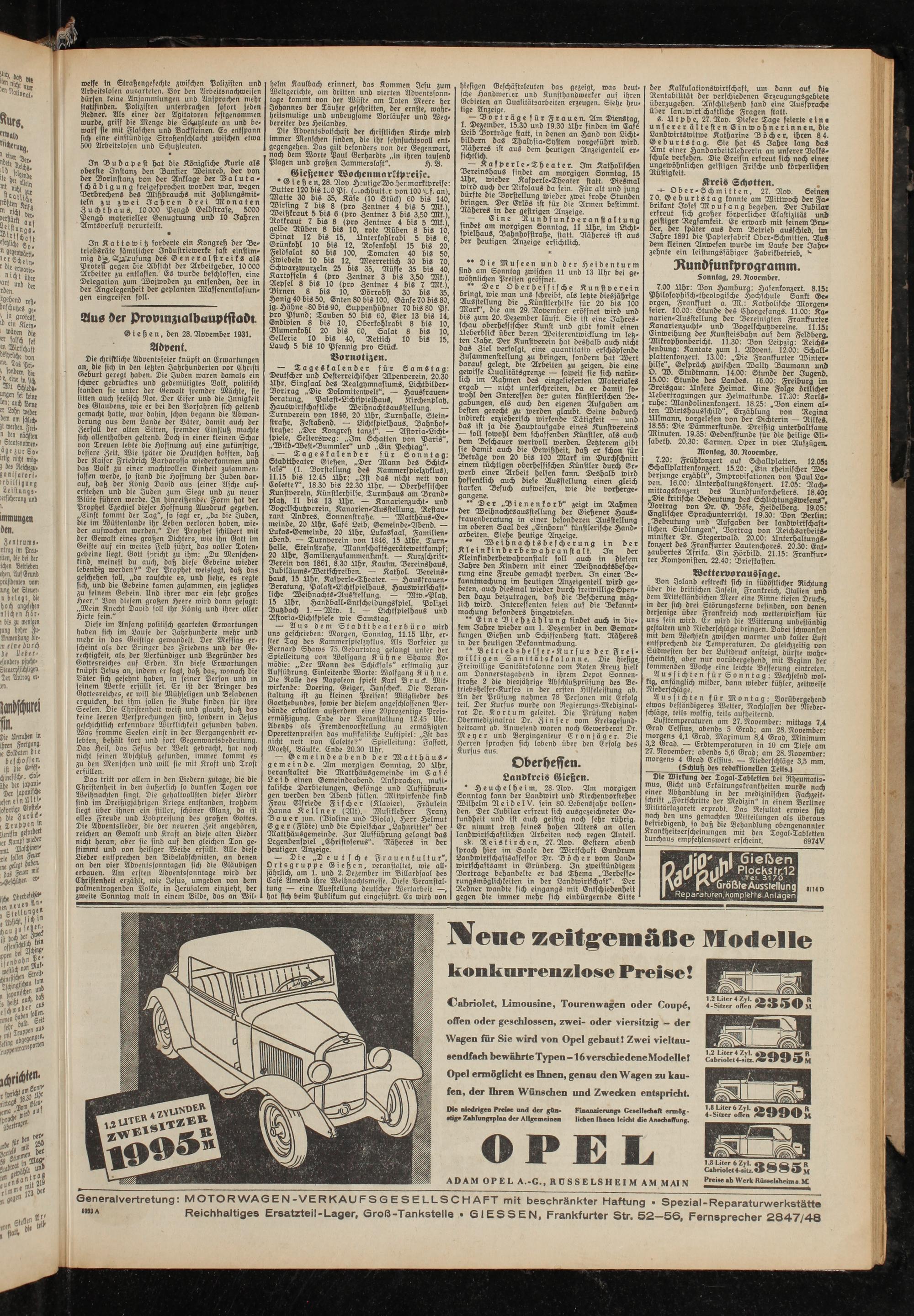 ** Eine Viehzählung findet auch in diesem Jahre wieder am 1. Dezember in den Gemarkungen Gießen und Schiffenberg statt. Näheres in der heutigen Bekanntmachung.